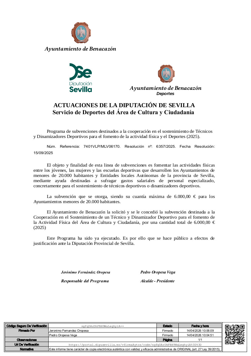 El Ayuntamiento de Benacazón informa, a efectos de justificación ante la Diputación Provincial de Sevilla (Servicio de Deportes del Área de Cultura y Ciudadanía), sobre el Programa de Subvenciones destinadas a la cooperación en el sostenimiento de Técnicos y Dinamizadores Deportivos para el Fomento de la Actividad Física y el Deporte (2026).