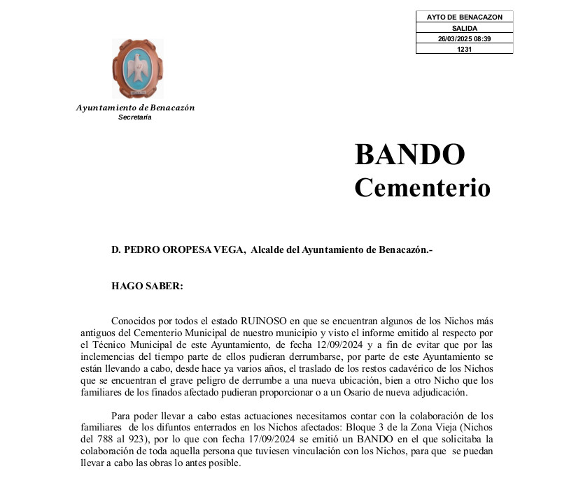 El Ayuntamiento de Benacazón informa del estado RUINOSO en que se encuentran algunos de los Nichos más antiguos del Cementerio Municipal de nuestro municipio y la necesidad de contactar con algún familiar antes del 10 de Abril de 2025. Llegada esa fecha, los Restos que no hayan sido “Reclamados”, se depositarán en el Osario Común de este Ayuntamiento.