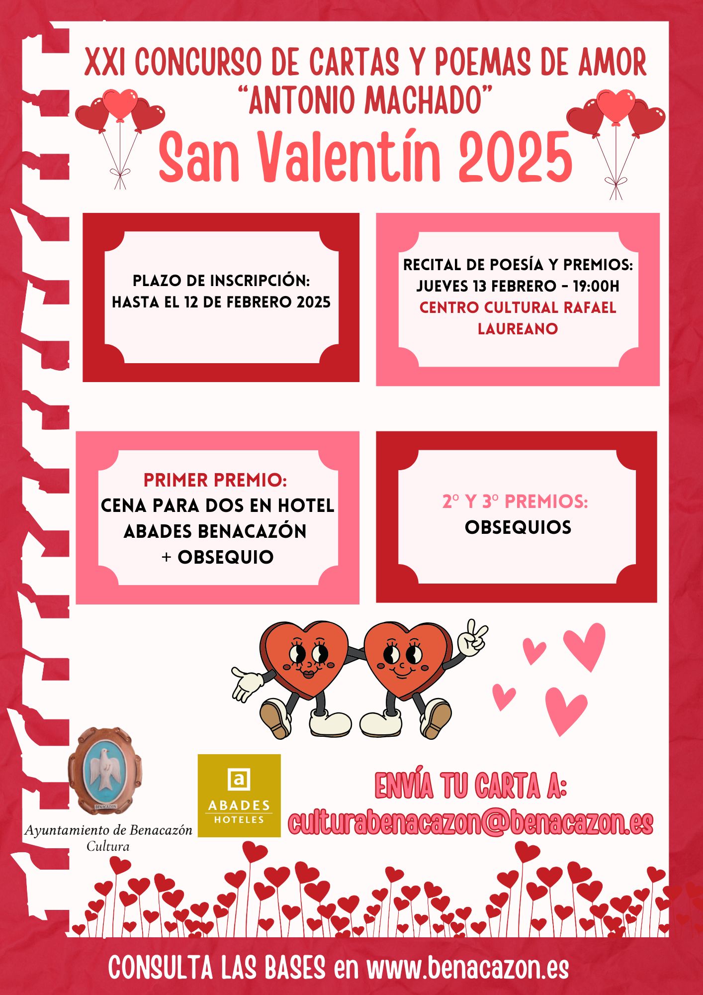 El Ayuntamiento de Benacazón informa sobre el “Concurso de Cartas y Poemas de Amor Antonio Machado”, una actividad organizada por la Concejalía de Cultura, que se celebra desde hace veintiún años en nuestro pueblo por el 14 febrero, Día de los Enamorados, con la finalidad de estimular la creatividad y fomentar el arte de la escritura entre nuestr@s vecin@s.