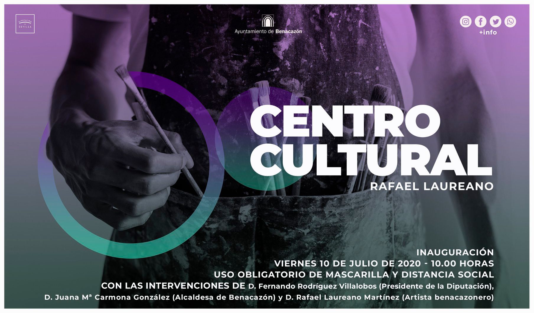 Desde el Ayuntamiento de Benacazón te informamos que, como producto de la labor realizada por el Área municipal de Comunicación, son varias las noticias aparecidas en los últimos días sobre la inauguración del “Centro Cultural Rafael Laureano” tuvo lugar el pasado viernes 10 de julio por parte de Fernando Rodríguez Villalobos, Presidente de la Diputación de Sevilla, Juana Mª Carmona González, Alcaldesa de Benacazón y el artista plástico Rafael Laureano.