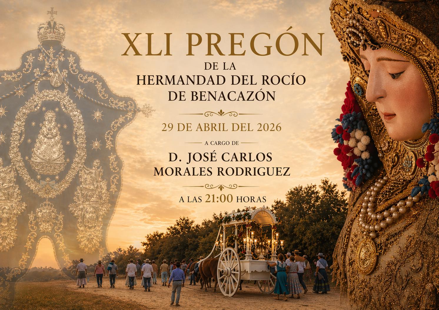 El Ayuntamiento de Benacazón informa de los Solemnes Cultos de la Hermandad del Rocío, que comenzarán con el Pregón rociero a cargo de D. José Carlos Morales Rodríguez, presentado por D. Miguel García Franco, que tendrá lugar en la Parroquia de Ntra. Sra. de las Nieves el miércoles 29 de abril a las 21:00 h.