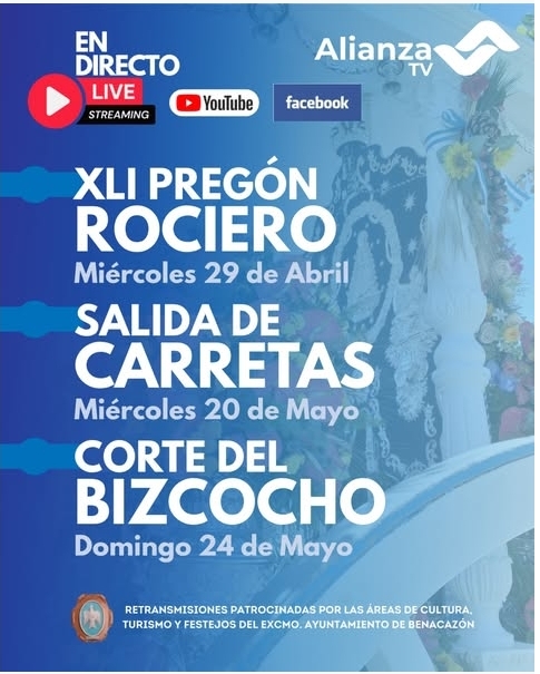 Las Concejalías de Festejos, Cultura y Turismo patrocinan la Retransmisión en Directo del Pregón por Alianza Audiovisual, así como la Salida de la Hermandad del Rocío de Benacazón el miércoles 20 de mayo, además del tradicional acto de cortar el bizcocho por el nuevo Hermano Mayor desde la Casa Hermandad del Rocío el domingo 24 de mayo.