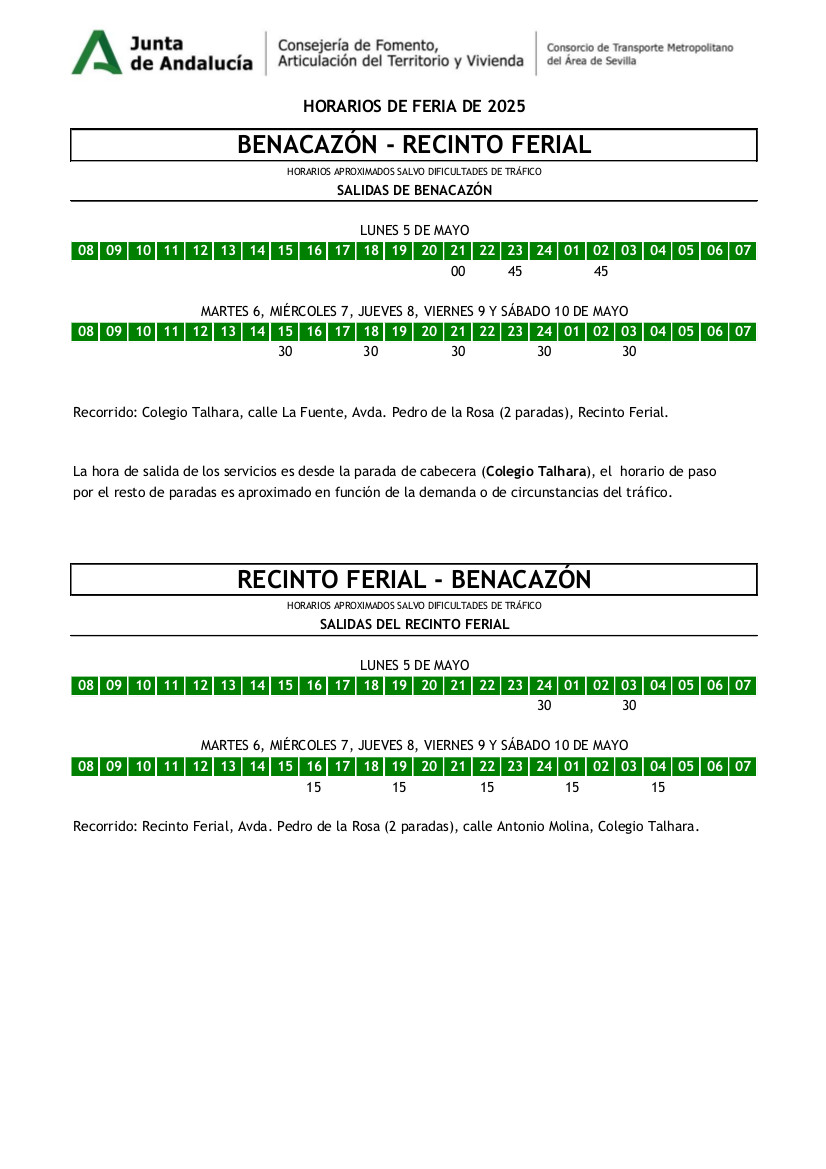 Aparte de los servicios habituales que viene prestando normalmente la Línea M-168 Benacazón-Sevilla, se establecen estos SERVICIOS ESPECIALES directos al recinto ferial.