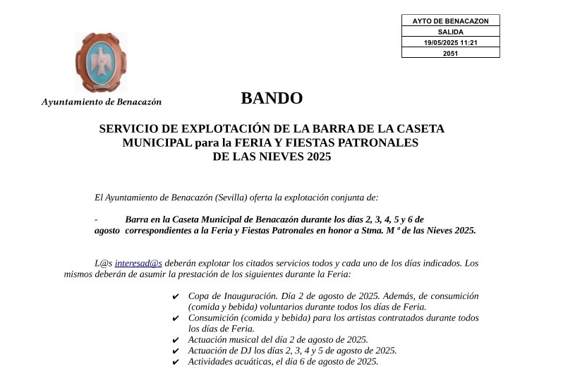 SERVICIO ESPECIAL DE AUTOBÚS DIRECTO DESDE BENACAZÓN A LA "FERIA DE SEVILLA 2025": desde Lunes 5 al Sábado 10 de Mayo