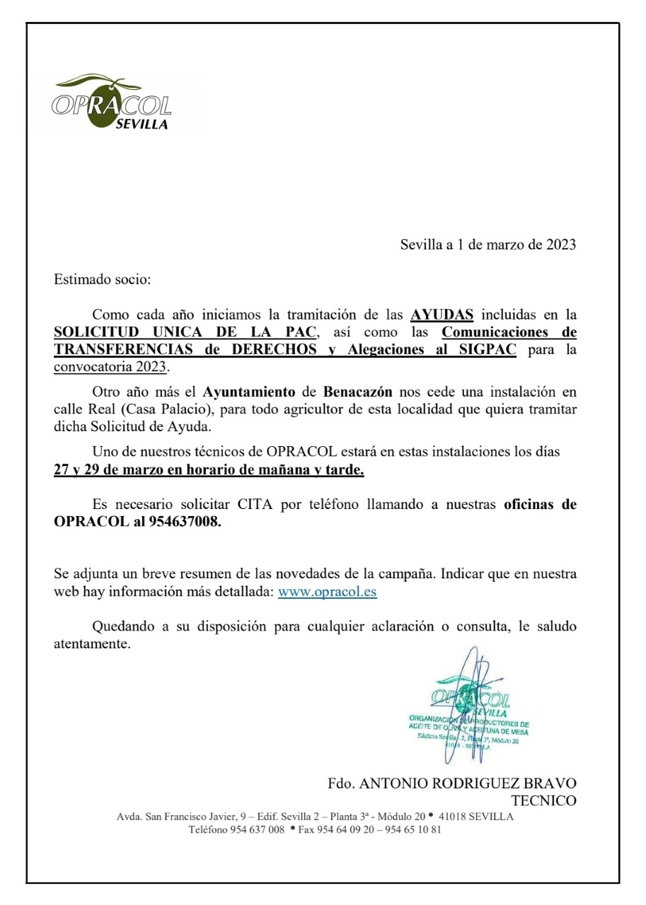 El Ayuntamiento de Benacazón informa que ofrecemos a los agricultores de nuestra localidad la posibilidad de tramitar las AYUDAS DE LA PAC para la convocatoria 2023, poniendo a disposición de OPRACOL la sede de la Casa Palacio (C/ Real 24), para atender directamente a nuestros agricultores.
