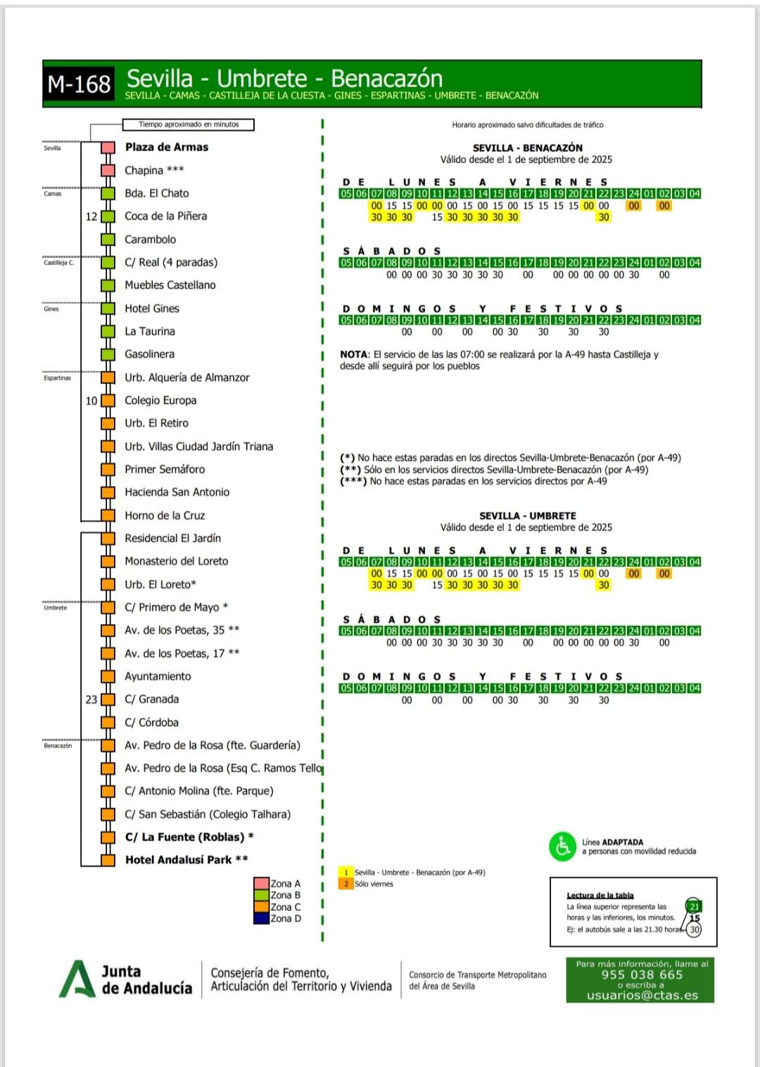 NUEVOS HORARIOS DE LA LÍNEA DE AUTOBÚS M-168 BENACAZÓN-SEVILLA DESDE SEPTIEMBRE 2025