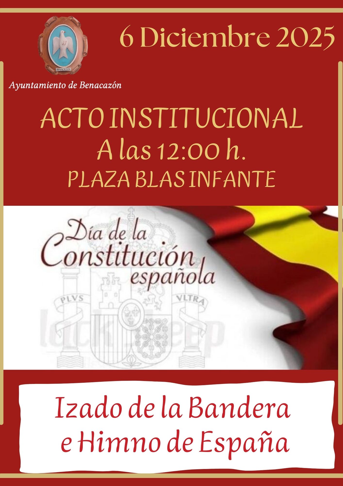 El Ayuntamiento de Benacazón informa sobre el acto institucional por la conmemoración del Día de la Constitución Española que tendrá lugar el Sábado 6 de Diciembre a las 12:00 h. en la Plaza Blas Infante.