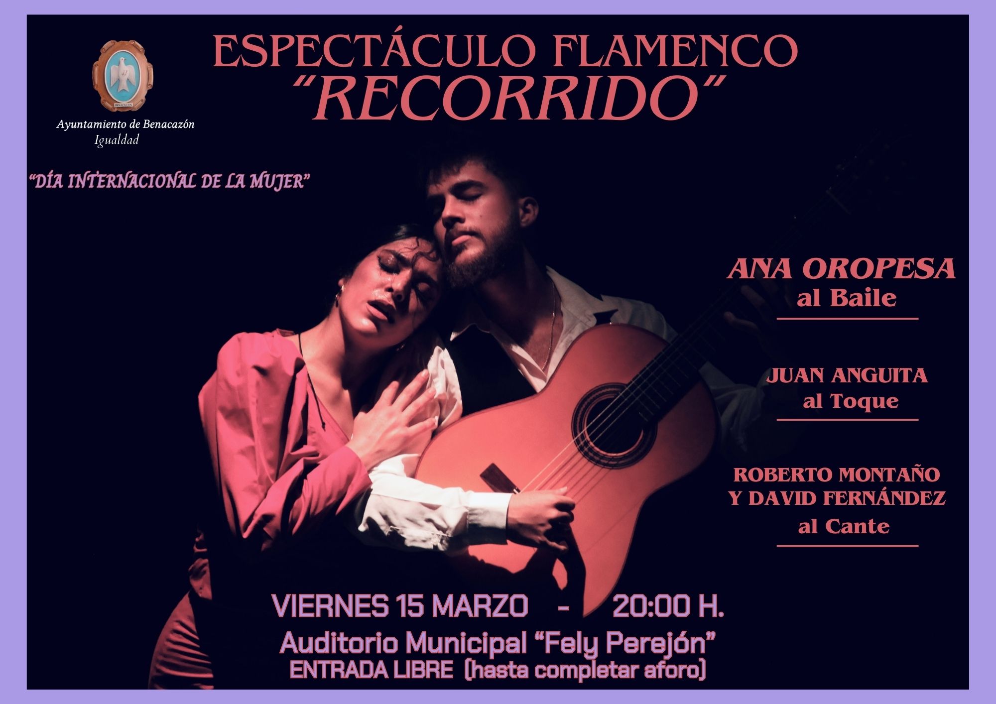 El Ayuntamiento de Benacazón informa sobre el Espectáculo Flamenco "RECORRIDO", que tendrá lugar el viernes 15 de marzo a las 20:30 h. en el Auditorio Municipal Fely Perejón, dentro de la Programación de Actividades organizadas por la Delegación de Asuntos Sociales e Igualdad, a través del Punto de Igualdad muncipal (PIM) con motivo del "DÍA INTERNACIONAL DE LA MUJER".