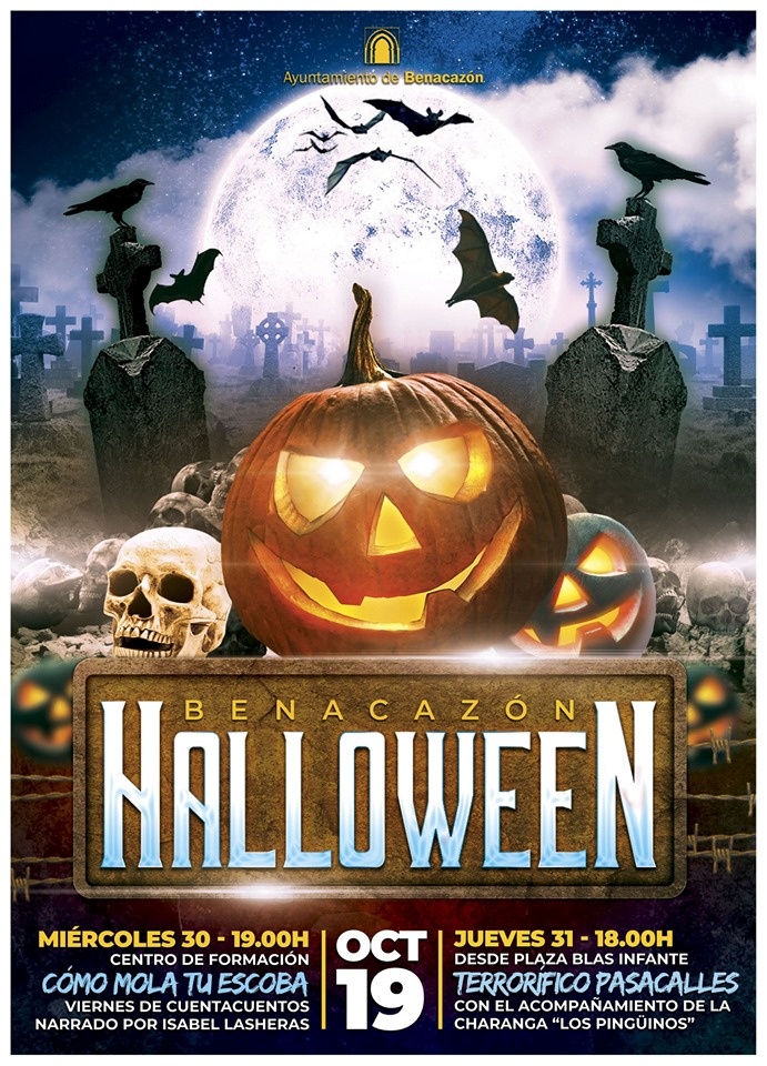 Desde el Ayuntamiento de Benacazón tenemos el placer de presentarte las actividades que se desarrollarán dentro de la celebración de la popular festividad de Halloween 2019, una iniciativa organizada por las Áreas municipales de Infancia y de Cultura.