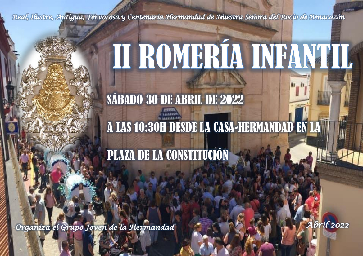 El Ayuntamiento de Benacazón informa sobre la II Romería Infantil que tendrá lugar el próximo Sábado 30 de Abril, organizada por el Grupo Joven de la Hermandad del Rocío de Benacazón. Partirá a las 10:00 horas desde la Casa Hermandad en la Plaza de la Constitución hacia la Iglesia Parroquial, donde tendrá lugar la Presentación del Simpecado ante la Patrona la Virgen de las Nieves, para seguir luego el recorrido por las calles céntricas del municipio.