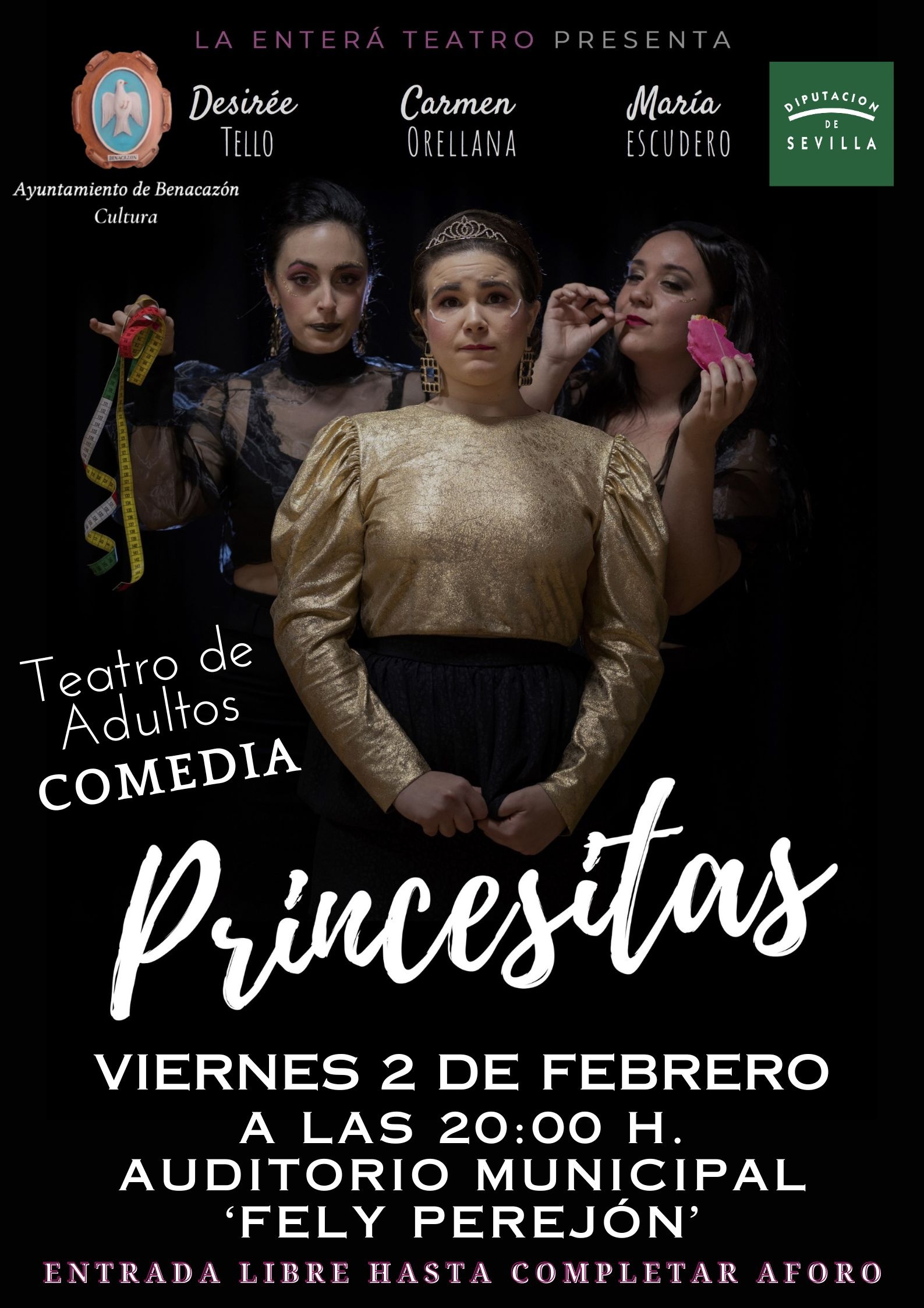 El Ayuntamiento de Benacazón informa sobre la próxima obra de Teatro de Adultos, la Comedia musical "PRINCESITAS" de la Compañía 'La Enterá Teatro', que será representada el viernes 2 de febrero a las 20:00 horas en el Auditorio Municipal Fely Perejón.