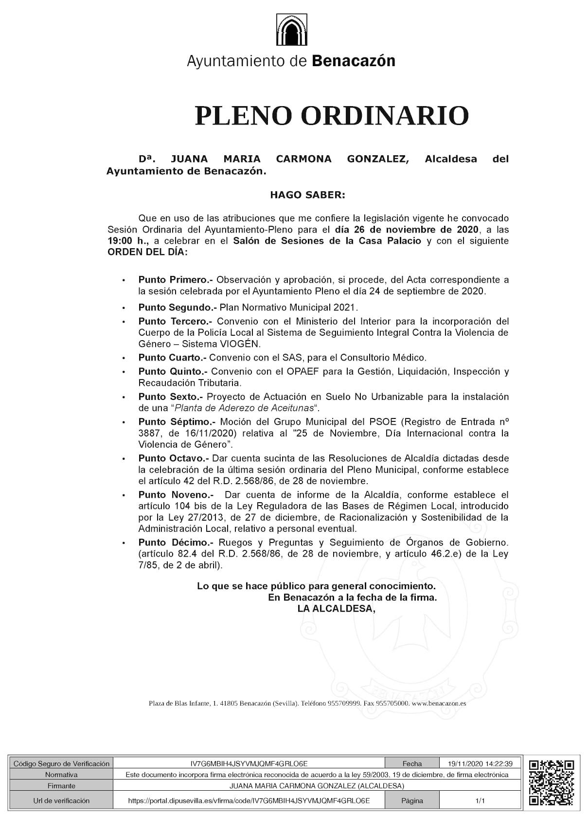 Desde el Ayuntamiento de Benacazón te informamos que el jueves 26 de noviembre de 2020 a las 19.00 horas en el Salón de Plenos (Casa Palacio, primera planta) tendrá lugar un Pleno Ordinario en el que se tratarán los puntos descritos en la imagen adjunta: