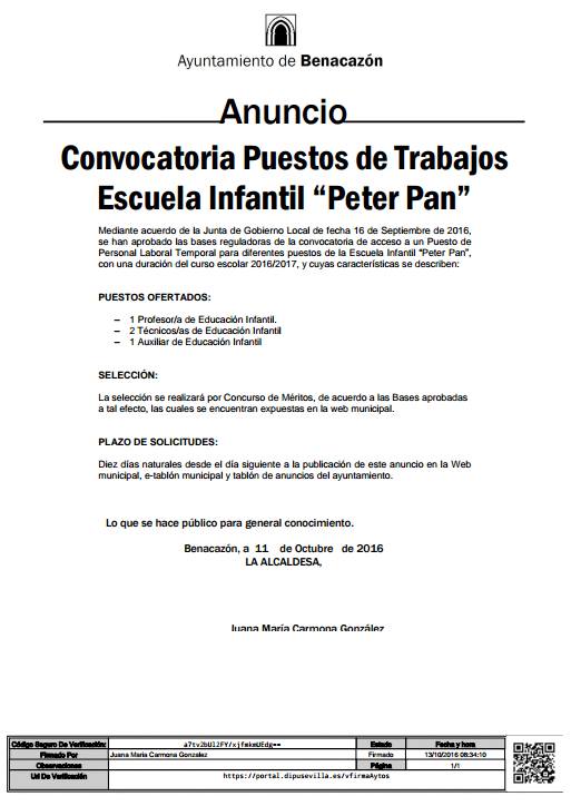 diferentes puestos de la Escuela Infantil “Peter Pan”, con una duración del curso escolar 2016/2017,
