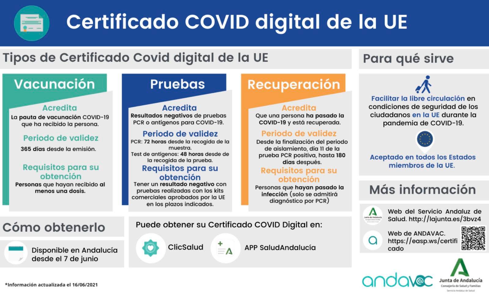 El Certificado COVID Digital de la UE, en vigor desde el pasado 1 de julio en todo el territorio nacional, recoge la pauta de vacunación, el certificado de recuperación o una PDIA negativa en las últimas 72 horas. En el caso de Andalucía, se puede descargar a través de ClicSalud+, de la app Salud Andalucía o en los propios centros de salud.