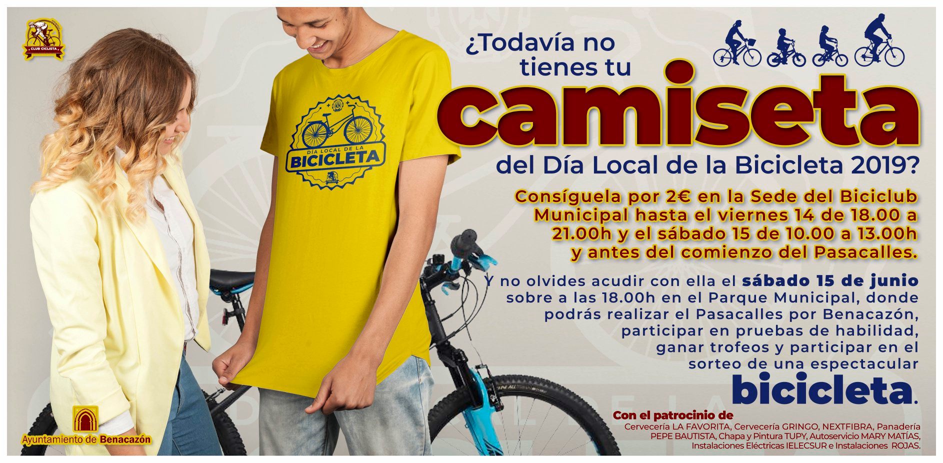 Desde el Ayuntamiento de Benacazón te recordamos que ya puedes conseguir te camiseta del Día Local de la Bicicleta 2019; una jornada familiar que tendrá lugar el sábado 15 de junio a partir de las 19.00 horas en el Parque Municipal. Si no te quieres quedar sin la tuya, puedes conseguirla inscribiéndote por 2€ en la sede del Club Ciclista Benacazón (C/ Luna) hasta el viernes 14 de 18.00 a 21.00 horas y el sábado 15 de 10.00 a 13.00 horas. También puedes inscribirte justo antes de iniciar el Pasacalles en un stand que se colocará junto a la Caseta Polivalente del Parque Municipal.