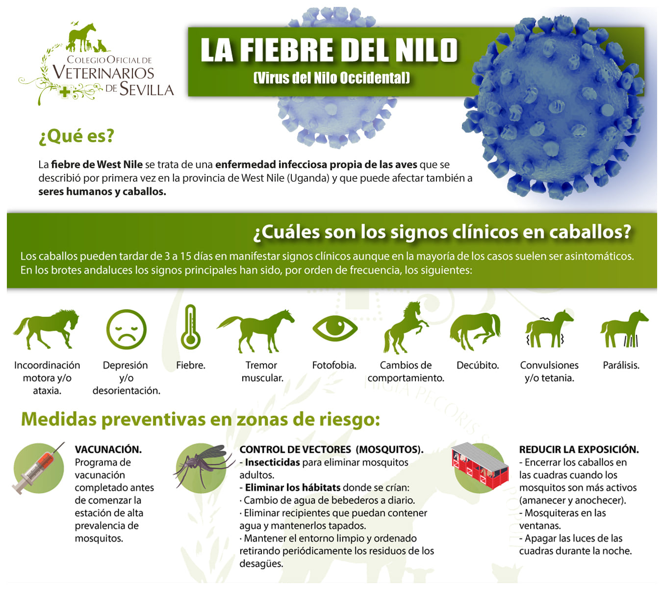 La fiebre del Nilo la transmiten los mosquitos a caballos y humanos, sólo después de haberse infectado por aves con ese virus. Una de cada 150 personas desarrolla síntomas y, en casos extremos, la muerte. Según los estudios, la mejor estrategia para eliminar la transmisión del virus del Nilo es reducir la población de mosquitos en las zonas habitadas y evitar que puedan alimentarse sobre los humanos. Para lo primero, los tratamientos recomendados son preventivos e implican el control de larvas utilizando BTI, unas toxinas de origen bacteriano que matan a las larvas. Para que no contacten con humanos, son recomendables las mosquiteras, usar mangas y pantalones largos, y aplicar repelentes químicos sobre todo en las primeras y últimas horas del día.
