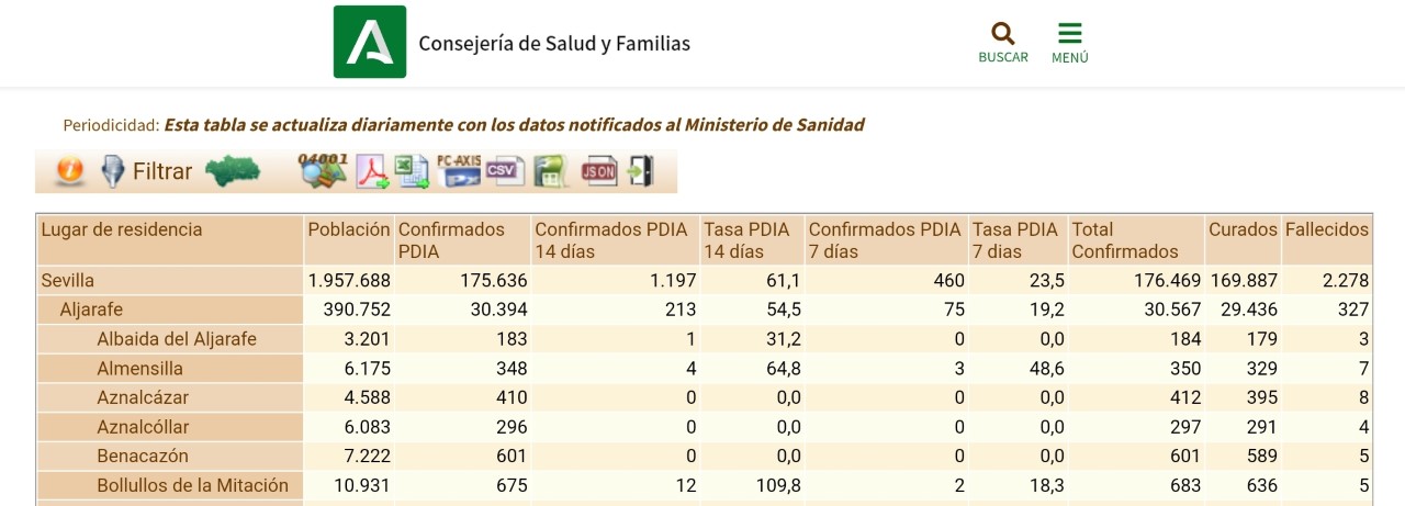Al respecto, trasladamos la información recogida en la página de la Consejería de Salud y Familias de la Junta de Andalucía, en colaboración con el Instituto de Estadística y Cartografía de Andalucía, cuyos datos se actualizan diariamente notificados por el Ministerio de Sanidad. Puedes consultar la Tabla correspondiente a los datos de la provincia de Sevilla en el enlace: https://www.juntadeandalucia.es/institutodeestadisticaycartografia/badea/operaciones/consulta/anual/38676?CodOper=b3_2314&codConsulta=38676