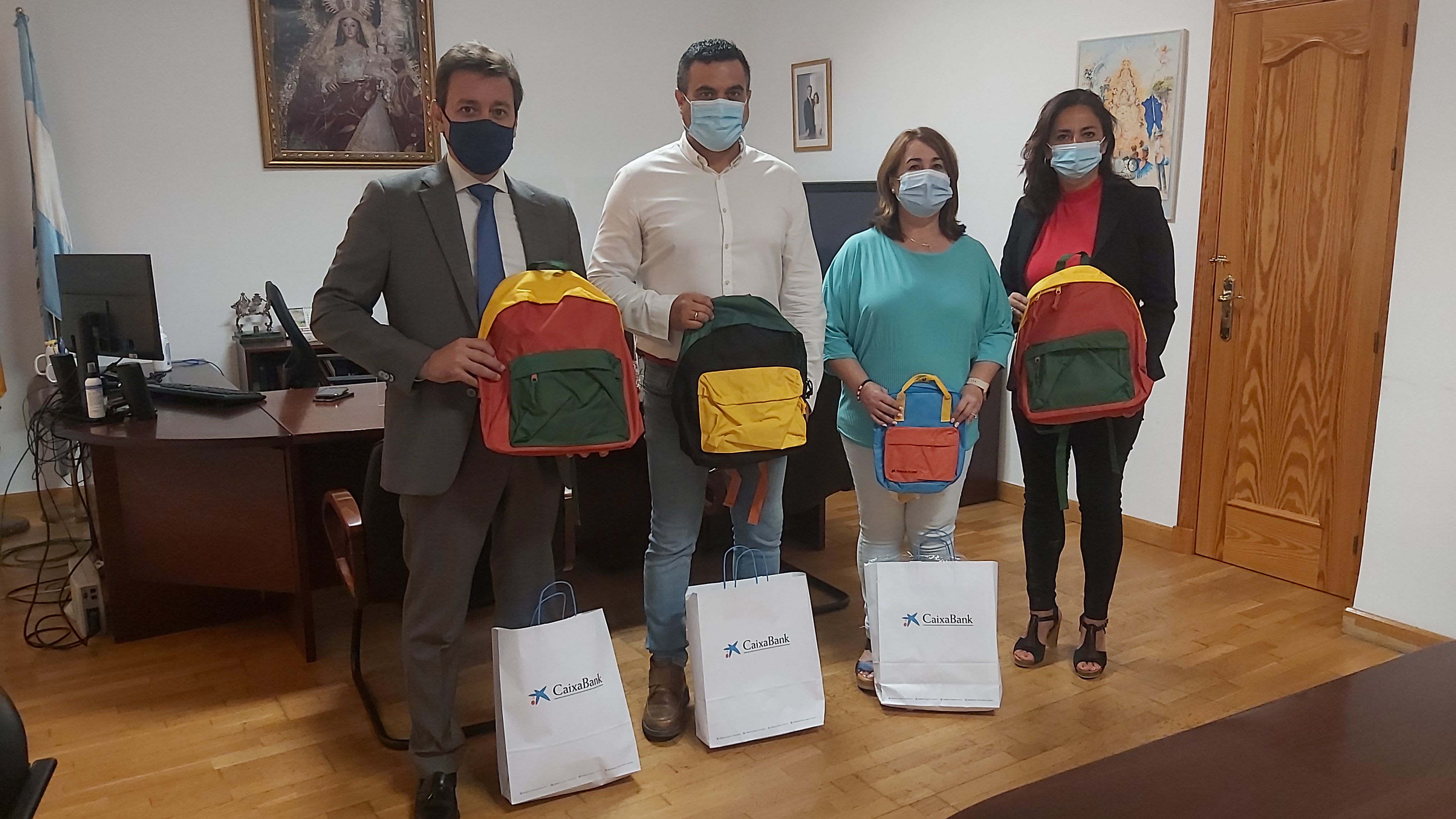 El Ayuntamiento informa que la entidad "CaixaBank" de Benacazón -a través de su Director, José Antonio Amador y la Subdirectora, Manuela Domínguez- ha entregado al consistorio benacazonero unos atractivos y completos kits de material escolar, destinados a alumnos de Infantil, Primaria y Secundaria en apoyo a familias del municipio, en una etapa de momentos complicados derivados de la pandemia. Con este gesto solidario pretenden contribuir a que la ilusión se extienda a todo el núcleo familiar, puesto que el inicio del curso supone un cambio que implica renovación, nuevos proyectos, nuevas amistades y la ilusión de nuestros hijos de estrenar cada año nuevo material escolar.