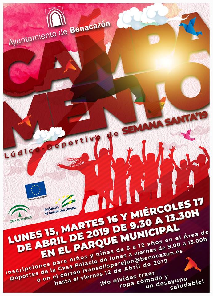 Desde el Ayuntamiento de Benacazón tenemos el placer de presentarte una nueva iniciativa gratuita desarrollada por nuestra Delegaciones municipales de Deportes y Cultura; el Campamento Lúdico-Deportivo de Semana Santa 2019 que tendrá lugar el lunes 15, martes 16 y miércoles 17 de Abril, en horario de 9.30 a 13.30 horas en el Parque Municipal y alrededores.