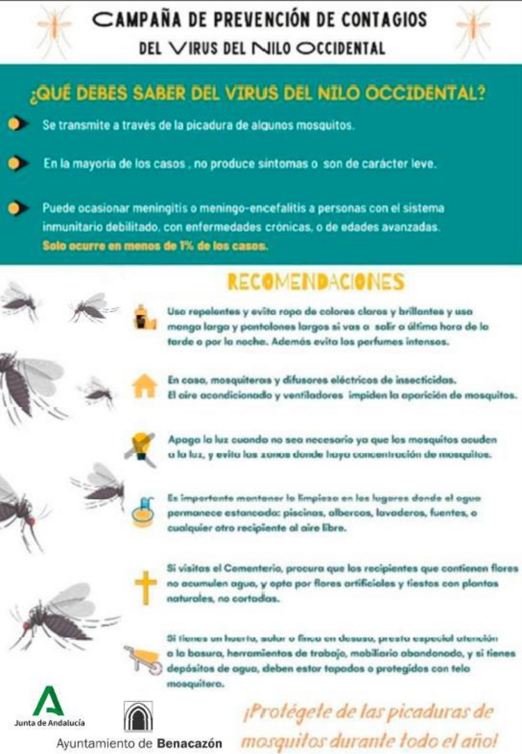 Estas labores de control forman parte del Programa de Vigilancia y Control Integral de Vectores de la Fiebre del Nilo Occidental (FNA) llevado a cabo desde la Consejería de Salud y Familias de la Junta de Andalucía, con la finalidad de evaluar y hacer un seguimiento técnico de la situación epidemiológica actual del Virus del Nilo. Trasladando a los representantes municipales una serie de medidas extraordinarias, tales como consejos de prevención, protección e información sobre la enfermedad, dirigidos a la ciudadanía en general, cuyas infografías adjuntamos a continuación.