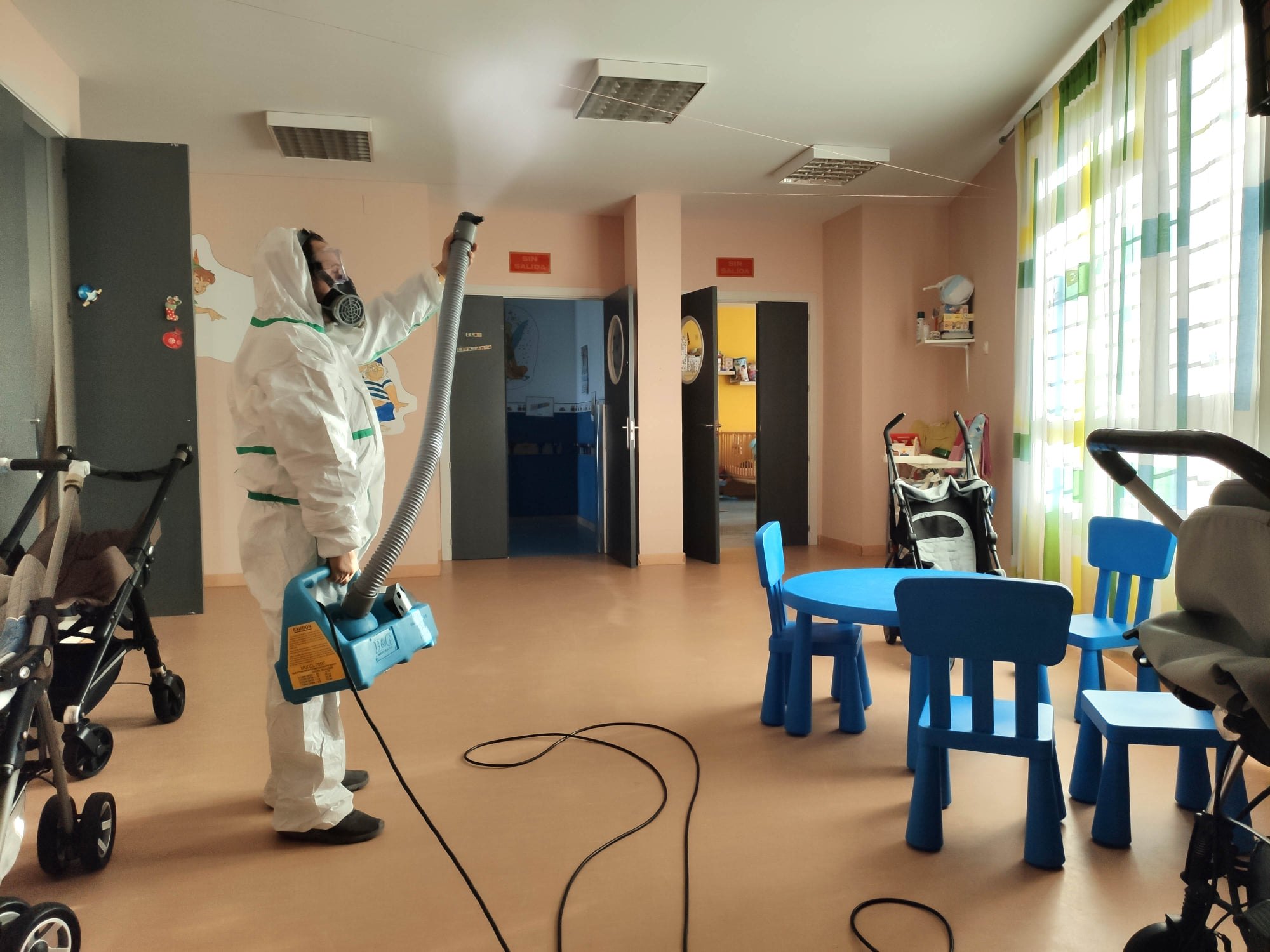 Durante la mañana de hoy 19 de noviembre, la empresa especializada Limpiezas Castor ha procedido a desinfectar los 172 metros cuadrados de este edificio municipal, llevando a cabo un tratamiento de nebulización en frío. El producto utilizado es OX-VIRIN, bactericida autorizado por el Ministerio de Sanidad para la desinfección de instalaciones, superficies, ambiental, utensilios y equipos.