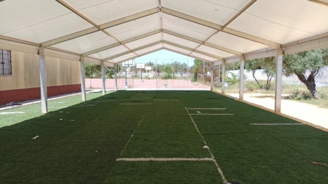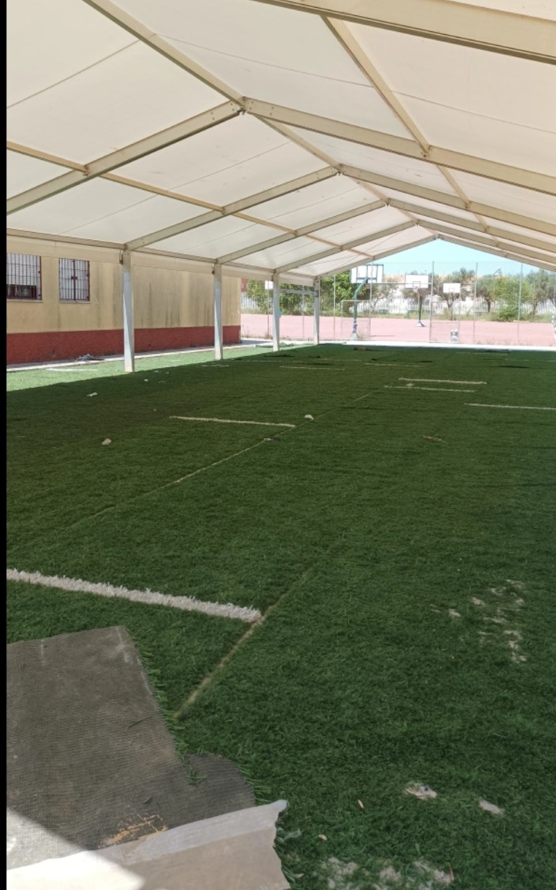 El proyecto empezó con la construcción de la carpa con los fondos de Inversión Europeos de 2020 concedidos al centro, que han ampliado este curso con la pista de cemento pulido. Además de cubrir la pista ahora con el césped artificial que les ha cedido el Ayuntamiento. Aunque aún se ultiman los trabajos, la pista ya presenta un excelente aspecto como podemos comprobar en las imágenes.
