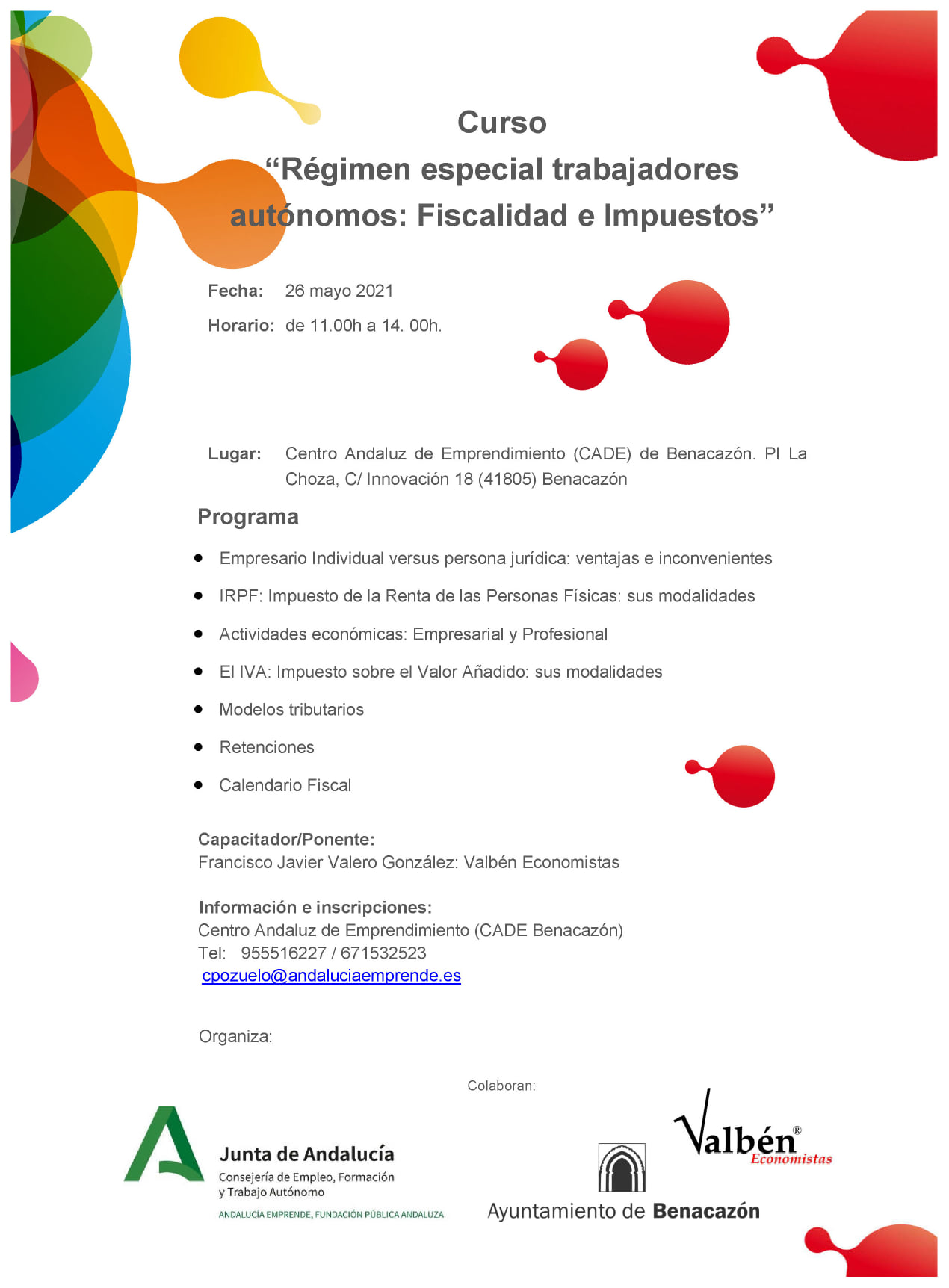 Desde el Ayuntamiento de Benacazón te informamos sobre el curso titulado “Régimen especial de trabajadores autónomos: Fiscalidad e Impuestos”, especialmente destinado a empresas y autónomos locales que tendrá lugar el miércoles 26 mayo de 2021 de 11.00h a 14.00 horas en el Centro Andaluz de Emprendimiento (CADE) de Benacazón, situado en el Polígono Industrial “La Choza” (C/ Innovación, 18). Esta jornada será impartida por el ponente Francisco Javier Valero González de Valbén Economistas.