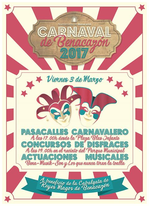 El Carnaval de Benacazón 2017 es un evento que por segundo año consecutivo ha llenado de alegría y fiesta las calles de nuestro pueblo. Después de muchos años, el regreso de esta fiesta, organizada por la Delegación de Juventud del Ayuntamiento de Benacazón, se compone de múltiples y diversas actividades que forman un divertido programa de fiestas para toda la familia. Además, cuenta con s ervicio de ambigú a precios populares a beneficio de la Cabalgata de Reyes Magos.