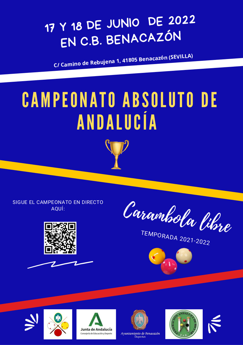El Ayuntamiento de Benacazón informa sobre la celebración en nuestro municipio del CAMPEONATO ABSOLUTO DE ANDALUCÍA "CARAMBOLA LIBRE" organizado por el CLUB de BILLAR BENACAZÓN, patrocinado por la Consejería de Turismo y Deporte de la Junta de Andalucía, con la colaboración de la FEDERACIÓN ANDALUZA DE BILLAR y la Concejalía municipal de Deportes.