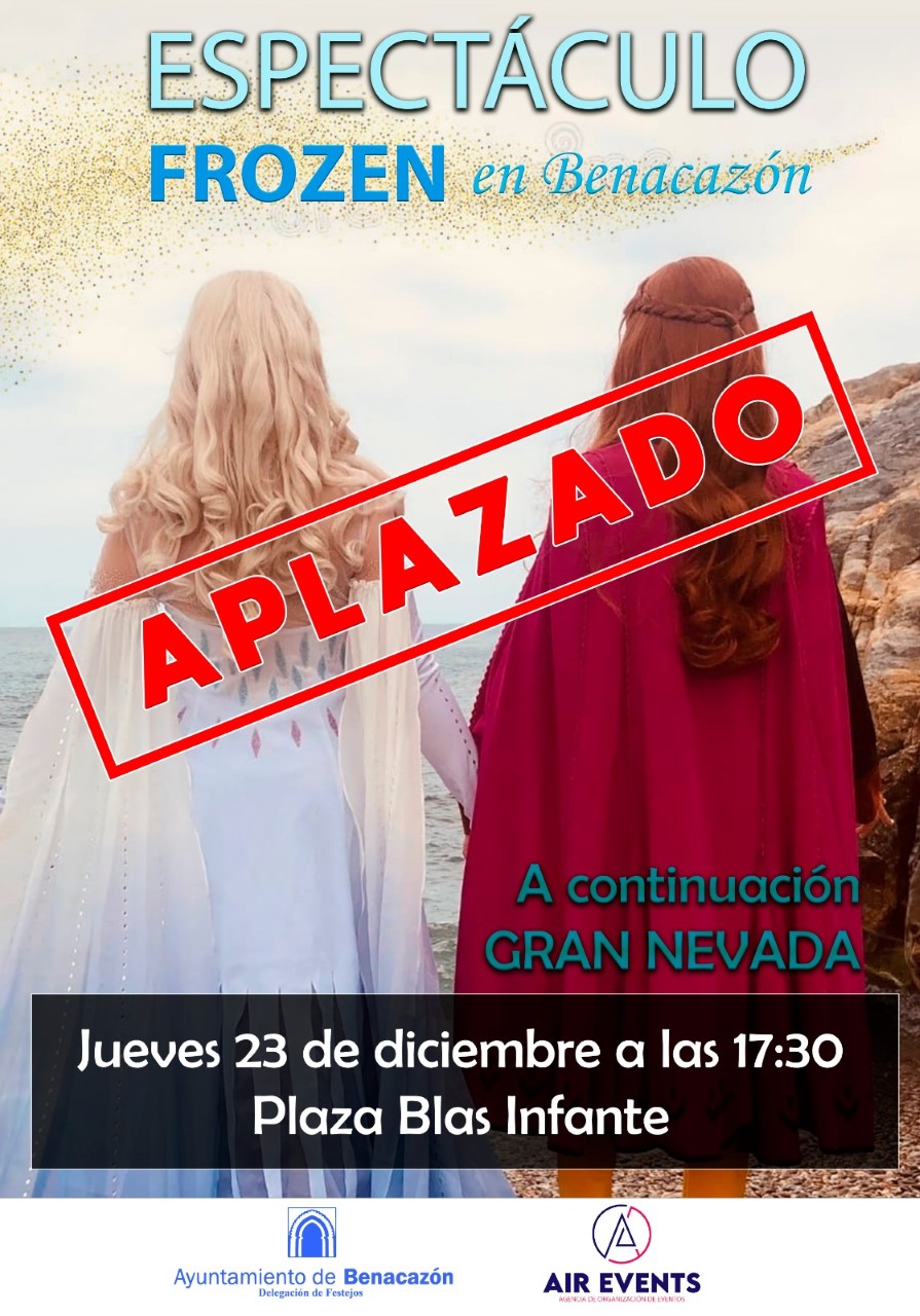 El Ayuntamiento de Benacazón informa que el espectáculo infantil "FROZEN" y "Gran Nevada", que estaban previstos en la Programación de Navidad para el 23 de Diciembre y que fue aplazado por la previsión meteorológica de lluvias, tendrá lugar el 4 de Enero de 2022, a las 17:30 horas en la Plaza Blas Infante.