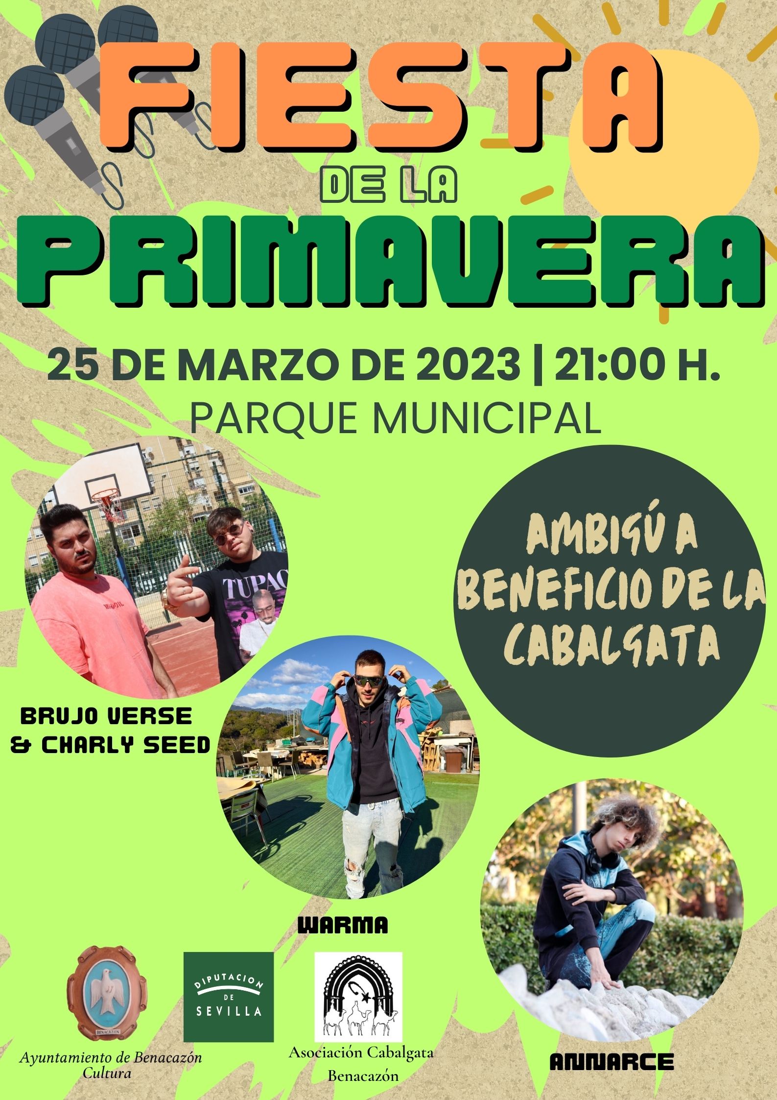 "FIESTA DE LA PRIMAVERA" CON LAS ACTUACIONES DE LOS RAPEROS BRUJO VERSE & CHARLIE SEE, WARMA Y ANNARCE: SÁBADO 25 MARZO, 21 H. PARQUE MUNICIPAL