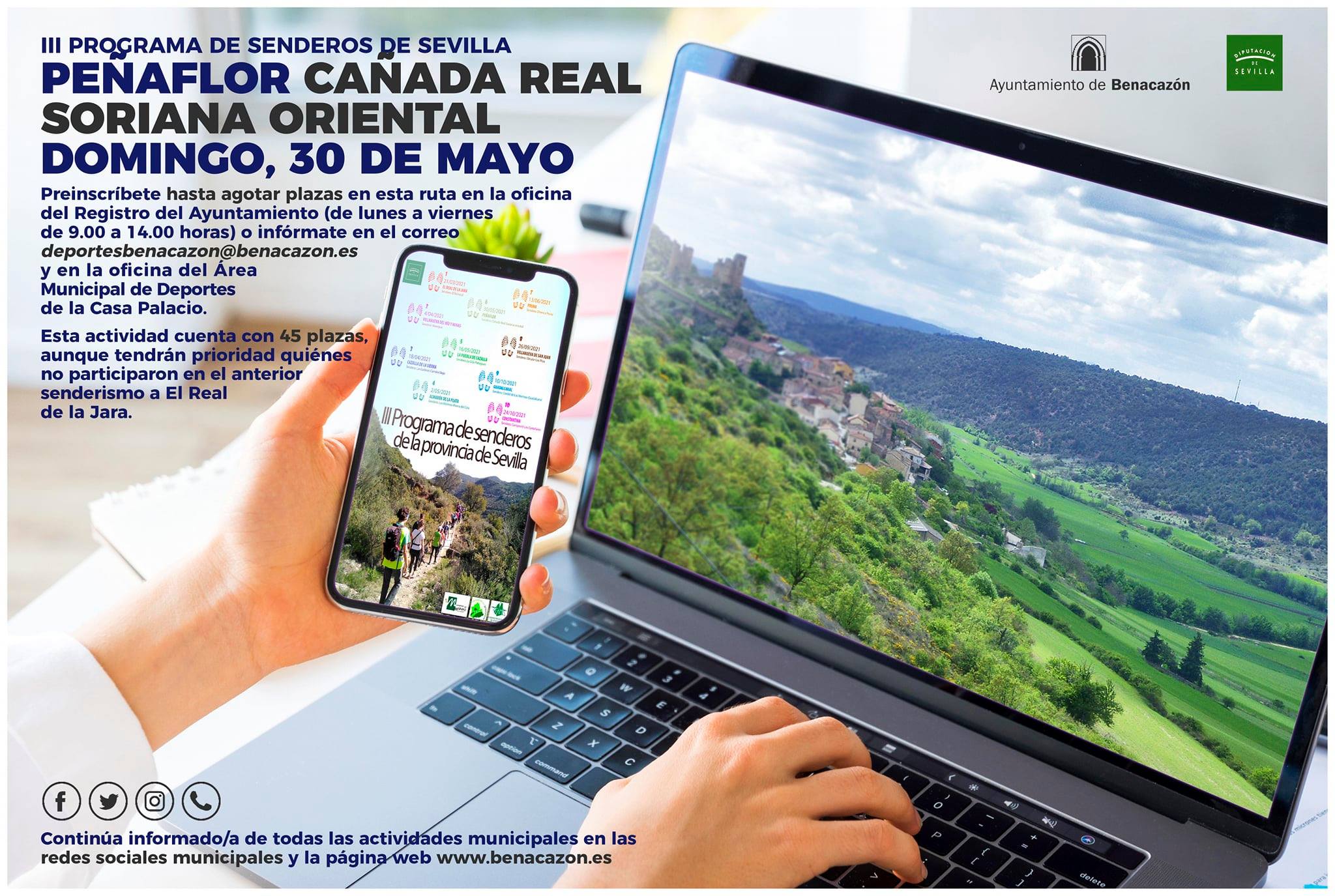 Desde el Ayuntamiento de Benacazón te informamos que la Diputación de Sevilla ha puesto en marcha la tercera edición del Programa de Senderos de la Provincia de Sevilla. La nueva jornada en la que Benacazón participará tendrá lugar el domingo 30 de mayo en Peñaflor y concretamente en su sendero Cañada Real Soriana Oriental.
