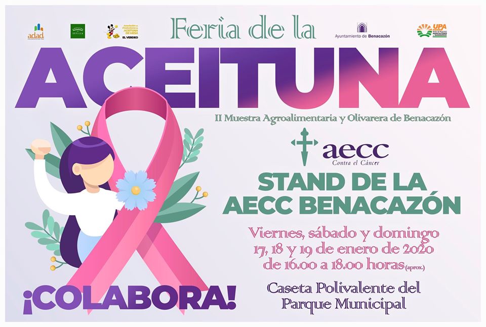 Desde el Ayuntamiento de Benacazón te informamos que, a propuesta del Área municipal de Salud, la Junta Local de la Asociación Española contra el Cáncer (AECC) situará una mesa informativa en la Feria de la Aceituna, II Muestra Agroalimentaria y Olivarera de Benacazón, de viernes 17 a domingo 19 de enero en horario de 16.00 a 18.00 horas.