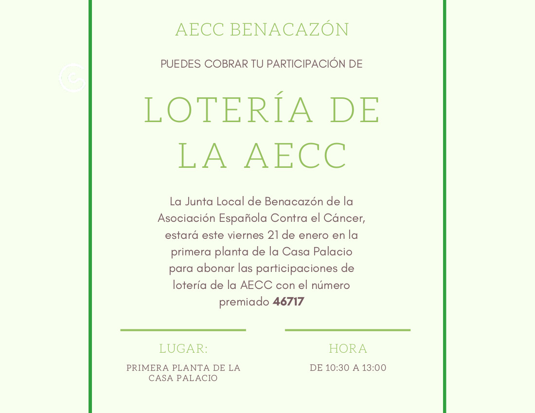 El Ayuntamiento de Benacazón informa que el próximo Viernes 21 de Enero de 2022, la Junta Local de la Asociación Española COntra el Cáncer (AECC) estará en el edificio municipal de la Casa Palacio (1ª Planta), de 10:30 a 13:00 horas, para abonar el importe de las participaciones premiadas en el Sorteo de la Lotería de Navidad del pasado 22 de Diciembre del Número 46717, que ha sido agraciado con 12,50 euros por participación.