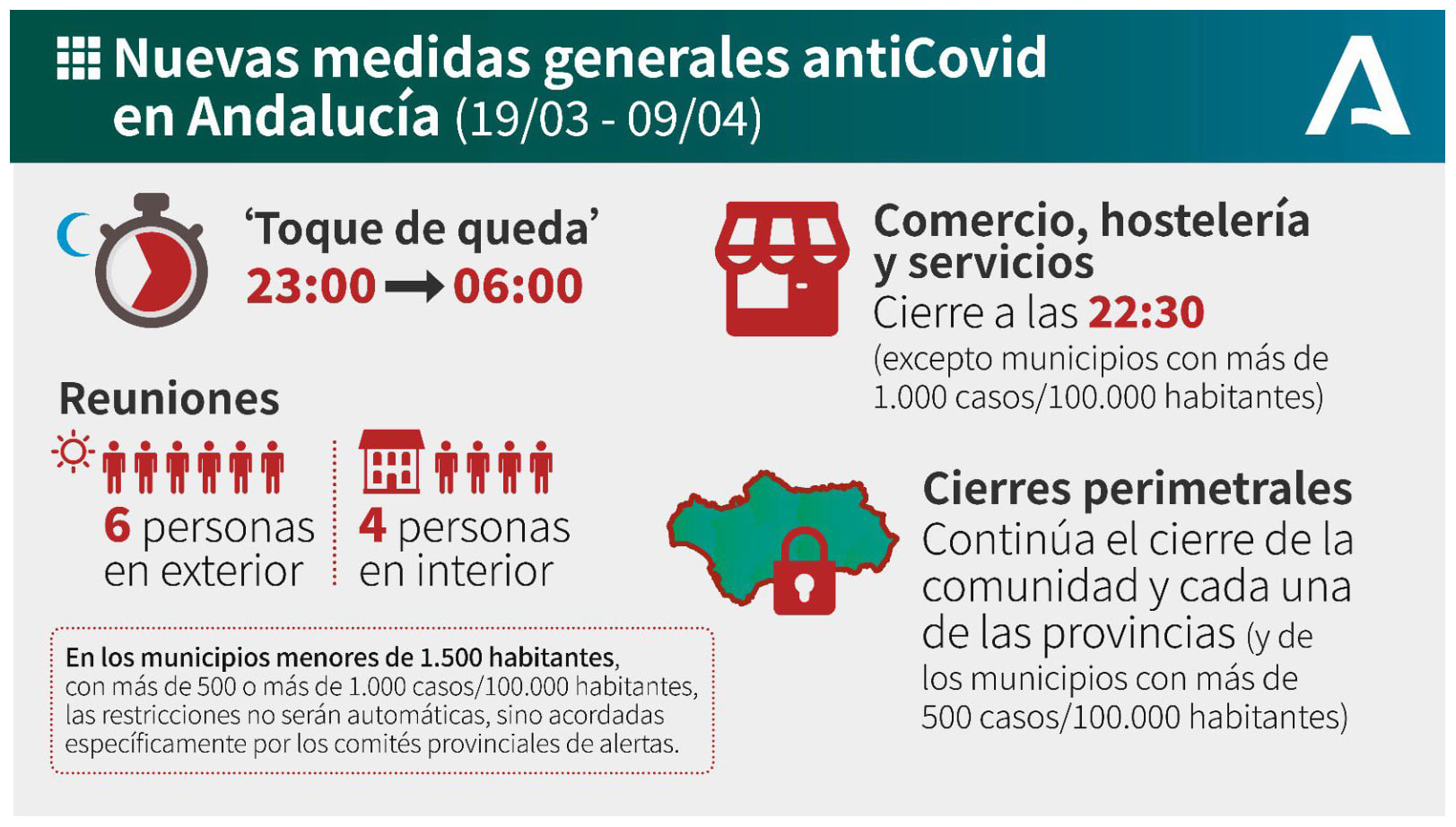 Desde el Ayuntamiento de Benacazón te informamos que la Junta de Andalucía ha anunciado nuevas medidas, con el objetivo de contener la propagación de infecciones causadas por la Covid-19 en nuestra comunidad autónoma. Estas medidas se aplican desde mañana viernes 19 de marzo hasta el 9 de abril, es decir, después de Semana Santa: