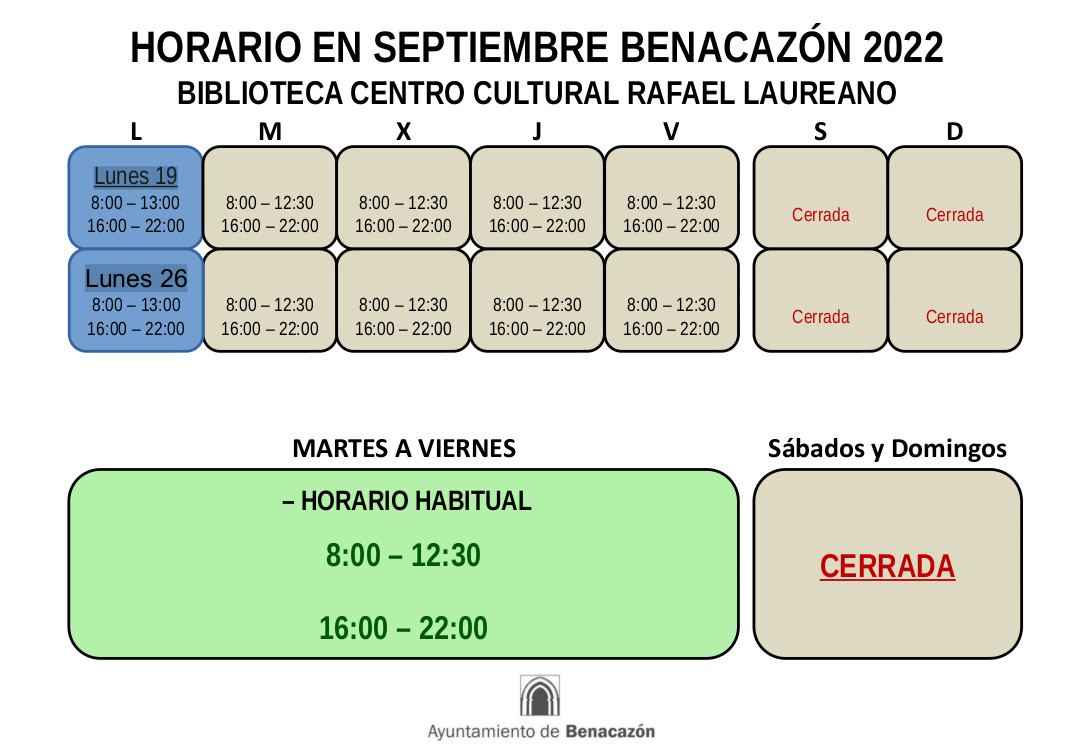 El Ayuntamiento de Benacazón informa del HORARIO DE LA BIBLIOTECA MUNICIPAL Y SALA DE ESTUDIOS durante el nuevo Curso 2022/2023, desde el próximo martes 20 de Septiembre.
