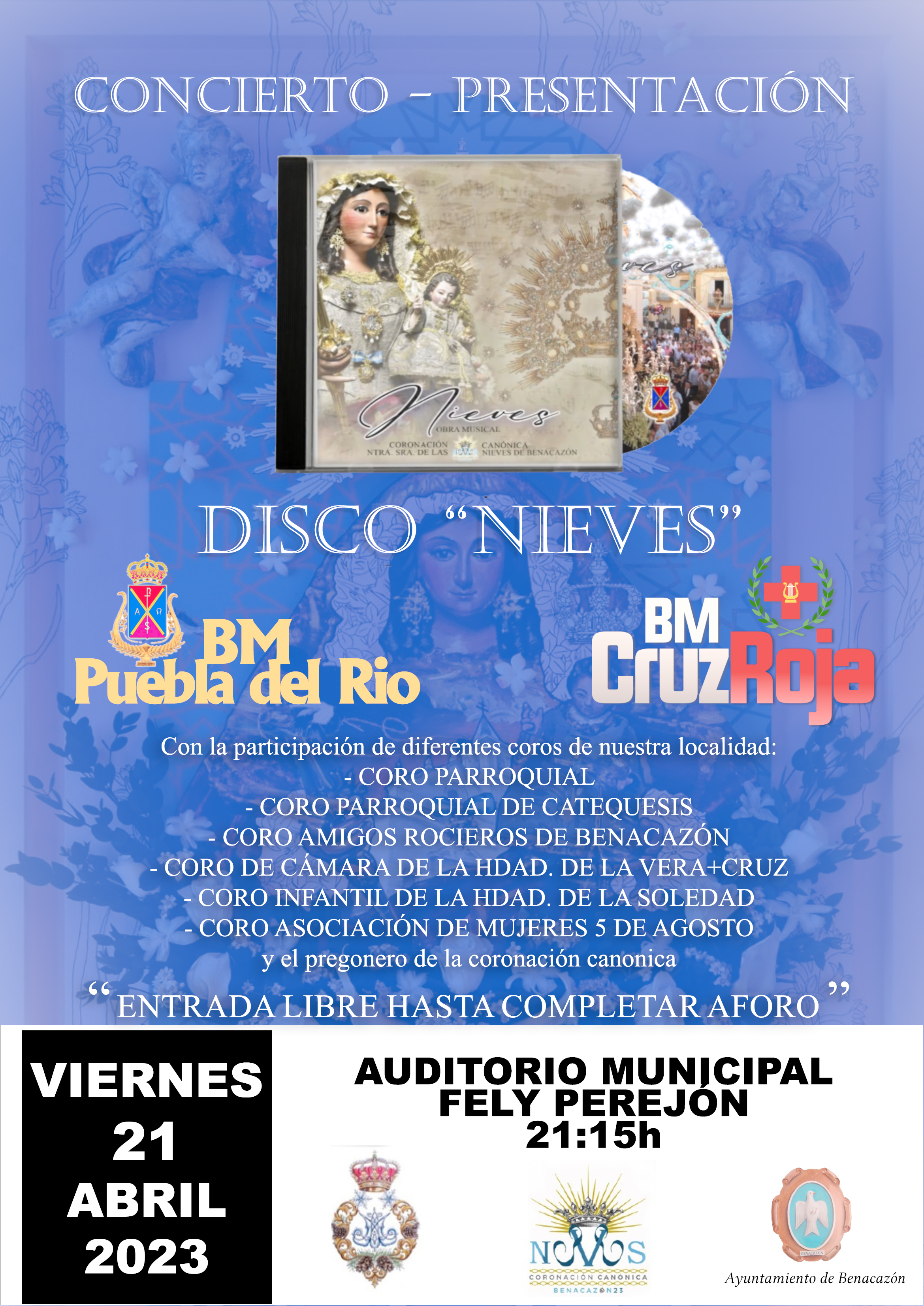 El Ayuntamiento de Benacazón informa sobre el acto de PRESENTACIÓN DEL DISCO "NIEVES", que tendrá lugar el Viernes 21 de Abril a las 21:15 h. en el Auditorio Municipal Fely Perejón. Una obra musical muy especial -producida por D. José Ramón Muñoz Berro y la discográfica Triana-, editada por la Comisión de Ntra. Sra. de las Nieves, con la destacada colaboración y Patrocinio de la Concejalía de Festejos del Excelentísimo Ayuntamiento de Benacazón.