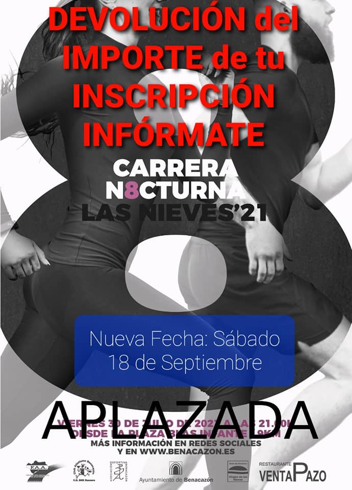 La Federación Andaluza de Atletismo (FAA), en coordinación con el Ayuntamiento de Benacazón, decidió aplazar la celebración de la "8 CARRERA NOCTURNA LAS NIEVES'21", cuya fecha inicial era el pasado 30 de Julio y que contaba con unos doscientos corredores inscritos, debido a la situación motivada por el Covid y en especial por la nueva variante “Delta”. Acordándose por ambas partes posponer la Nocturna al SÁBADO 18 de SEPTIEMBRE, si la situación de la pandemia lo permite.