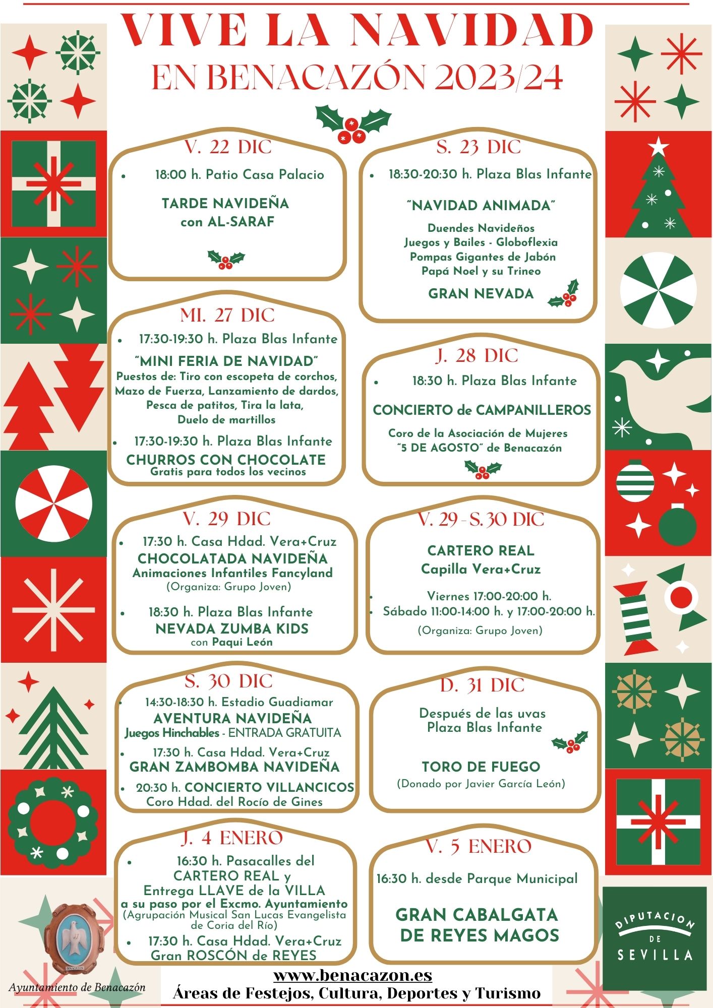 El Ayuntamiento de Benacazón presenta la Programación "VIVE LA NAVIDAD EN BENACAZÓN" 2023/2024, cuyas actividades se desarrollarán desde el Viernes 1 de Diciembre de 2023 con el ENCENDIDO DEL ALUMBRADO hasta el próximo 05 de Enero de 2024, día de la Gran Cabalgata de Reyes Magos.
