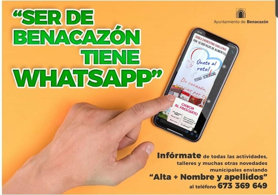 El Ayuntamiento de Benacazón informa que se vuelve a poner en marcha el canal de difusión municipal “Ser de Benacazón tiene WhatsApp”, al que puedes unirte para recibir todas las novedades municipales. Este servicio, gestionado por la Delegación de Comunicación, facilita a la ciudadanía información de interés y actualidad relativa al municipio a través de su propio teléfono móvil.