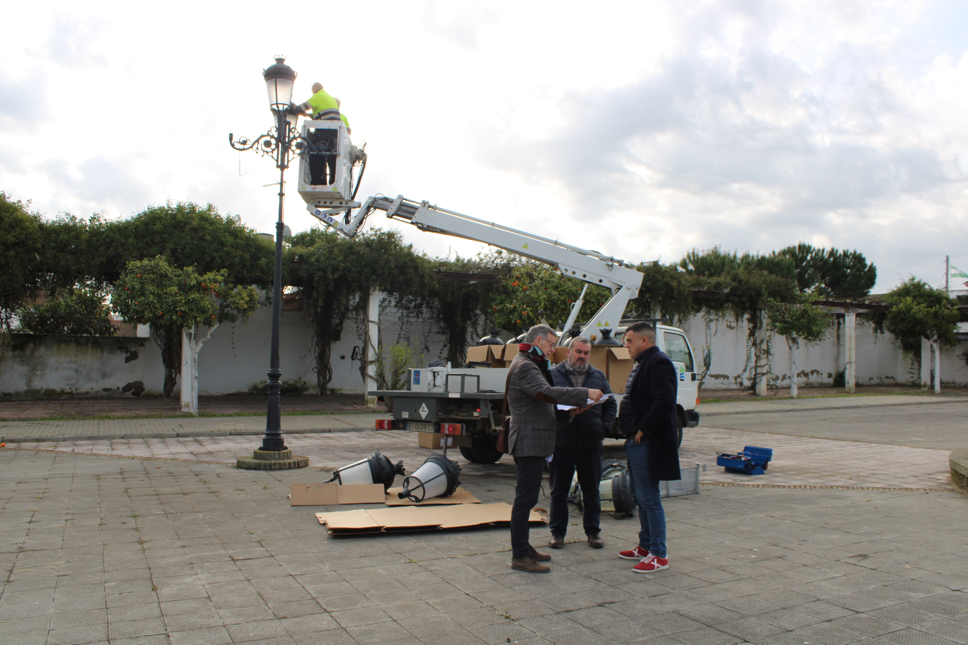 El Ayuntamiento de Benacazón informa sobre la Renovación de Luminaria del Parque Municipal con tecnología Led, con el objetivo de mejorar la eficiencia energética. La instalación de la nueva iluminación estos días, está supervisada por el Alcalde Pedro Oropesa, el Concejal de Urbanismo y Desarrollo Local Antonio Bautista y el técnico del área José Valero.