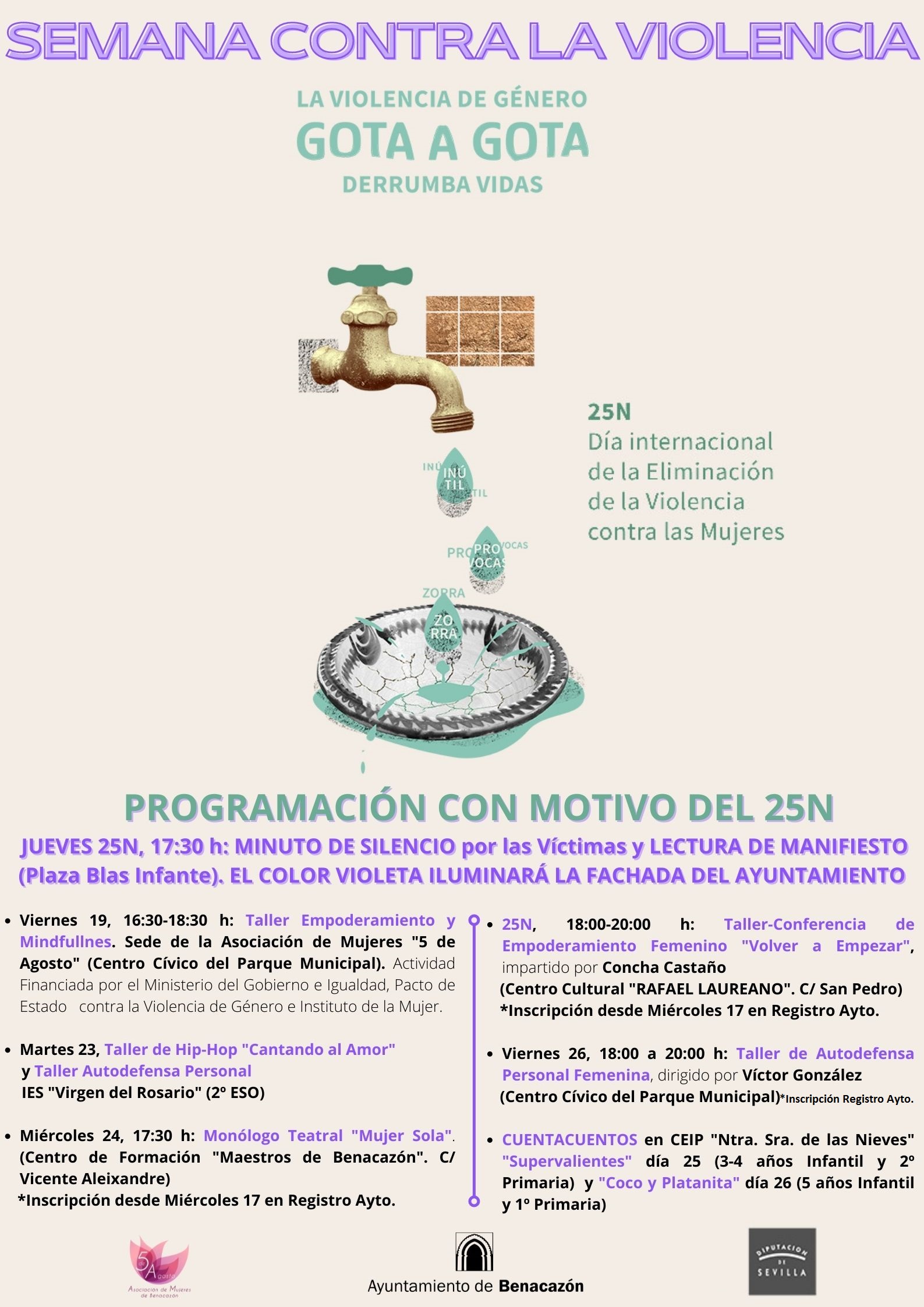 El Ayuntamiento de Benacazón informa sobre el conjunto de actividades coordinadas desde el Área municipal de la Mujer e Igualdad con motivo de la conmemoración del 25N, "Día Internacional contra la Violencia de Género". Esta semana temática se compone de las siguientes actividades:
