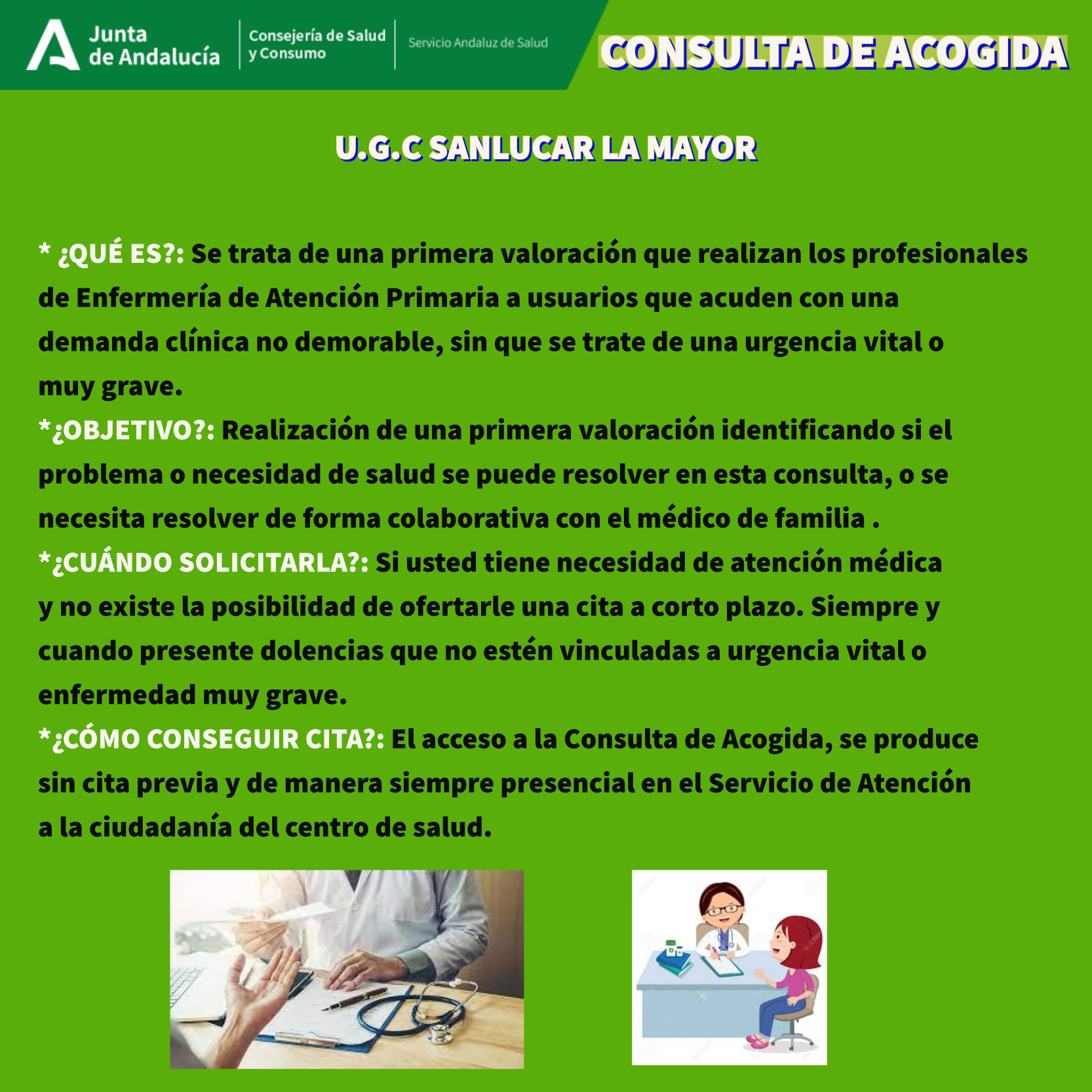 Desde la Concejalía de Salud del Ayuntamiento de Benacazón, a través de la UGC (Unidad de Gestión Clínica de Sanlúcar la Mayor, a la que pertenece nuestro municipio), informamos sobre el Servicio de CONSULTA DE ACOGIDA que se ofrece desde los Centros de Salud.