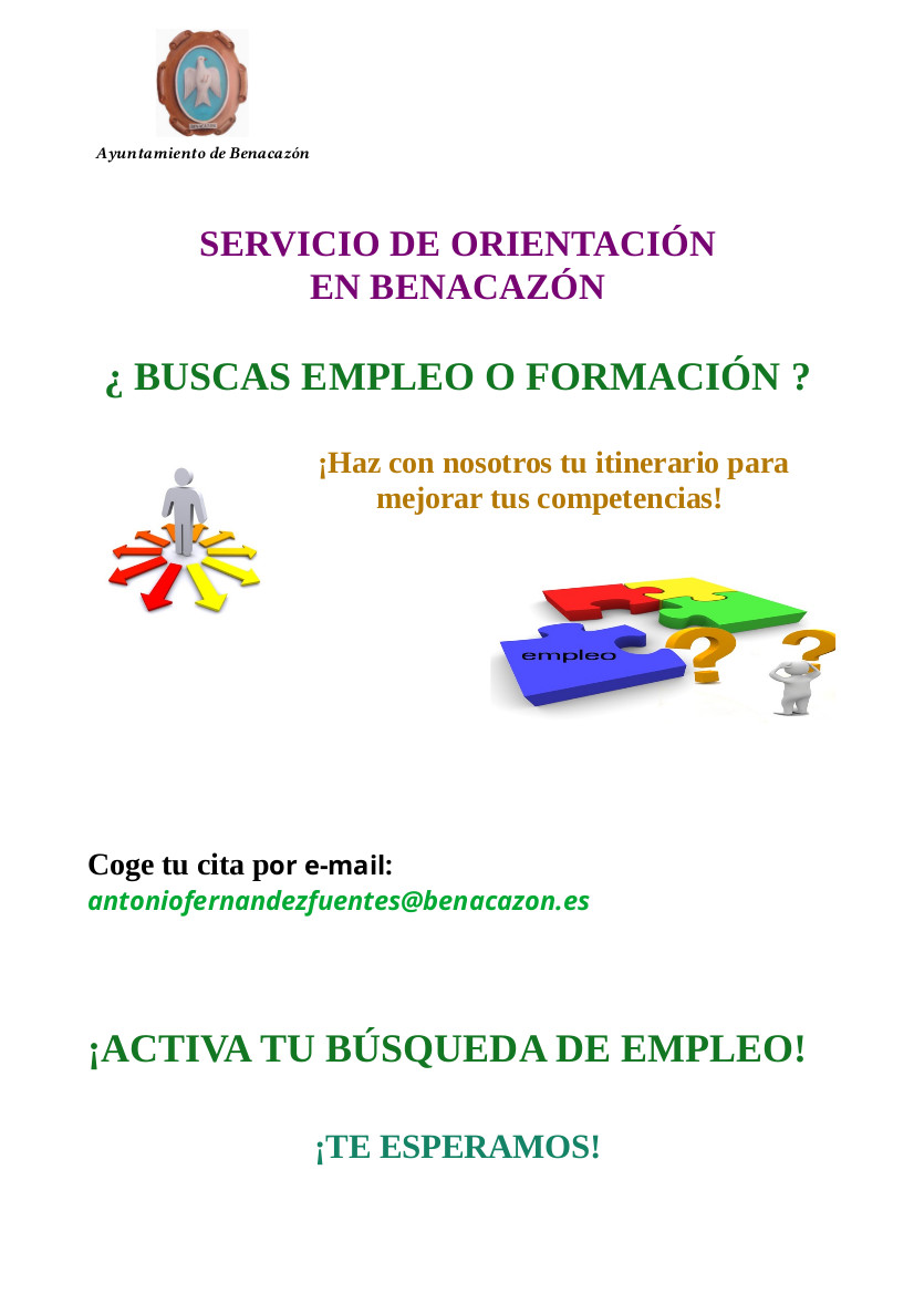 SERVICIO DE "ORIENTACIÓN LABORAL Y FORMACIÓN" EN BENACAZÓN: ACTIVA TU BÚSQUEDA DE EMPLEO!!