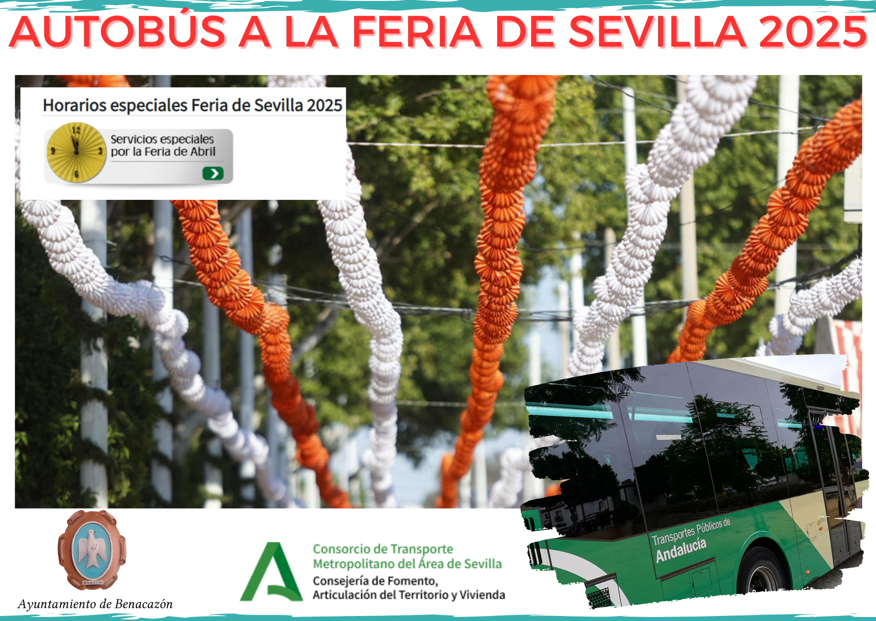 El Ayuntamiento de Benacazón informa del SERVICIO ESPECIAL DE AUTOBÚS DIRECTO DESDE BENACAZÓN A LA FERIA DE SEVILLA, prestándose este año por primera vez cada día de la Feria desde el 5 de Mayo, "Lunes del pescaíto", hasta el Sábado de feria, 10 de Mayo.