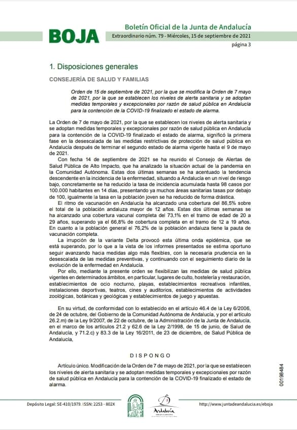 Tanto la provincia de Sevilla al completo como el resto de Andalucía se encuentran en nivel 1 de alerta sanitaria por COVID, cuyas medidas entraron en vigor en el día de ayer, 16 de Septiembre. Por tanto se relajan las restricciones en toda la comunidad, gracias al descenso de la tasa de incidencia del coronavirus en los diferentes territorios. La mayoría de esas modificaciones afectan a los aforos de los diferentes espacios públicos y privados.