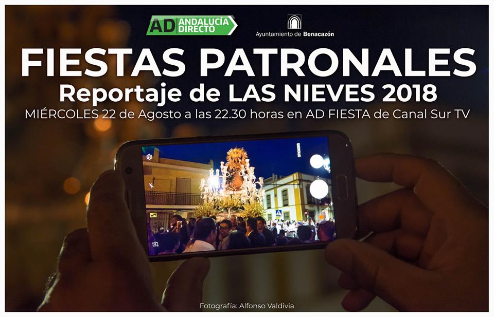 Desde el Ayuntamiento de Benacazón te informamos que las cámaras del programa de televisión "AD Fiesta" de Canal Sur acudieron durante las pasadas Fiestas Patronales a nuestro pueblo para recoger el testimonio de los vecinos y vecinas asistentes en la procesión de la Virgen de las Nieves, así c omo a los preparativos de nuestros tradicionales “toros de fuego” y otros muchos aspectos de nuestras fiestas. Es un placer comunicarles que la emisión de dicho reportaje tendrá lugar el próximo miércoles 22 de Agosto de 2018 a partir de las 22.30 horas en la cadena de televisión Canal Sur.