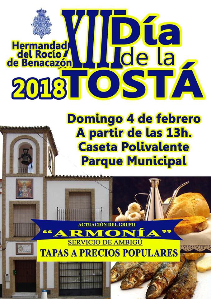 XIII DÍA DE LA TOSTÁ 2018 ORGANIZADO POR LA HERMANDAD DEL ROCÍO DE BENACAZÓN: DOMINGO 4 DE FEBRERO A PARTIR DE LAS 13:00 H. EN LA CASETA POLIVALENTE DEL PARQUE MUNCIPAL