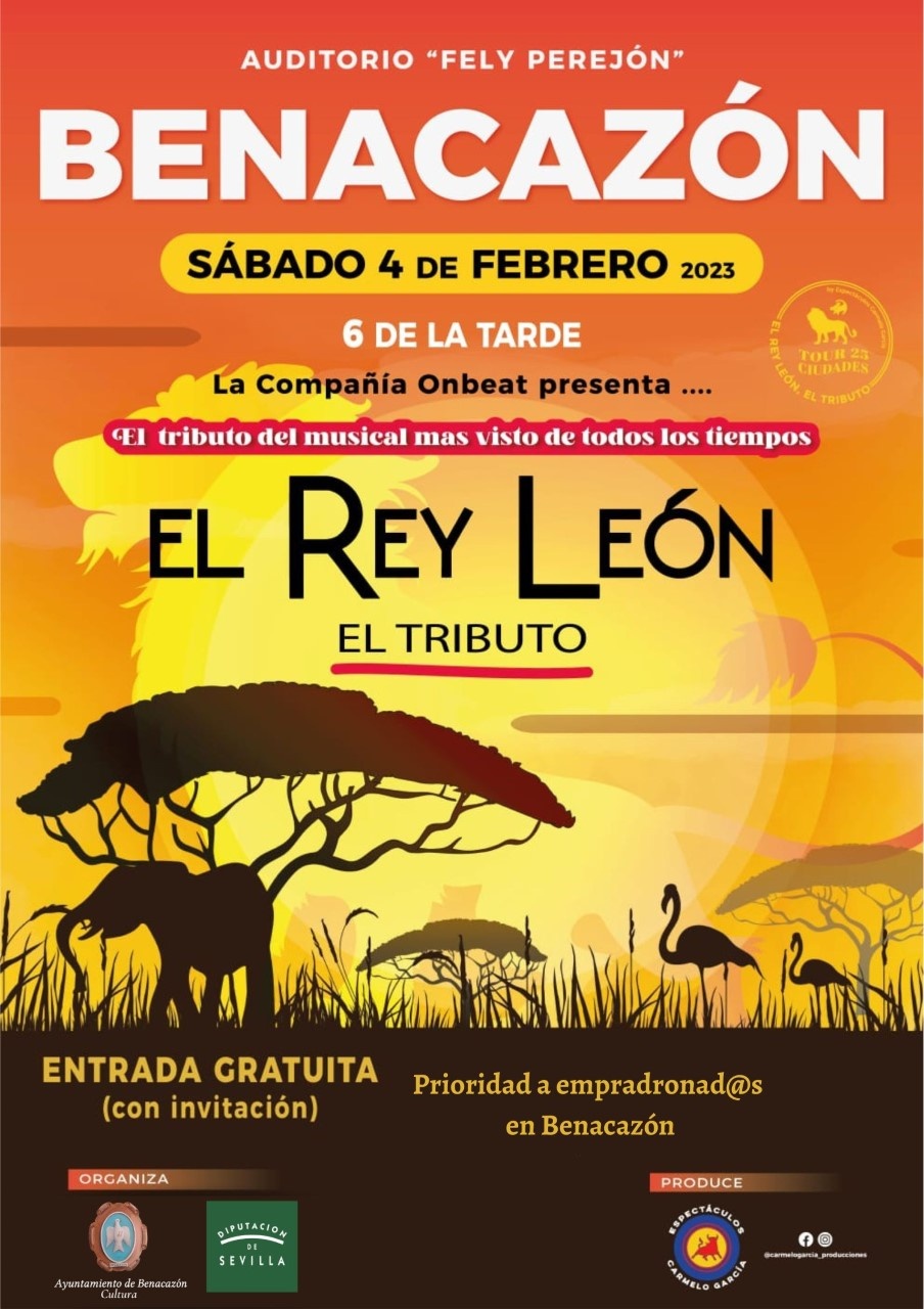 EL 4 DE FEBRERO LLEGA A BENACAZÓN EL ESPECTÁCULO TRIBUTO DEL GRAN MUSICAL "EL REY LEÓN". ENTRADA GRATUITA PRIORIDAD EMPADRONADOS (PREVIA RECOGIDA DE INVITACIONES)