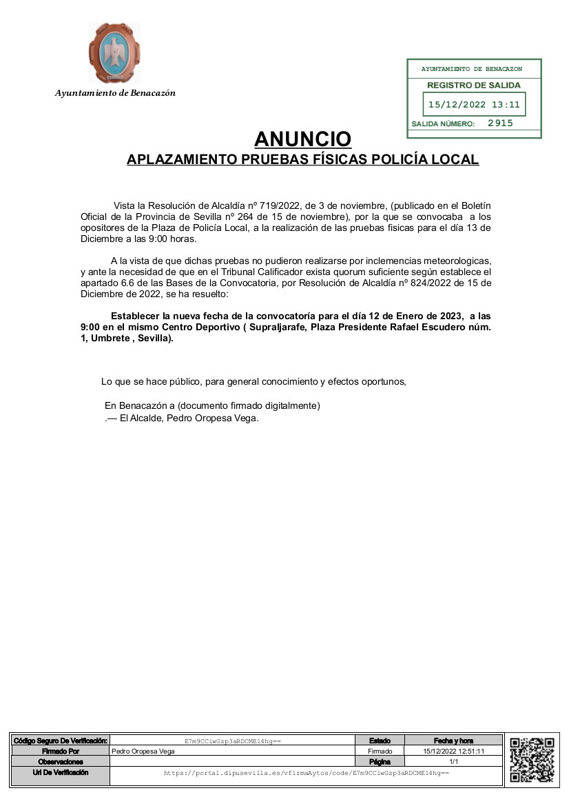 El Ayuntamiento de Benacazón informa que, en base a la Resolución de Alcaldía nº 719/2022, de 3 de noviembre, (publicado en el Boletín Oficial de la Provincia de Sevilla nº 264 de 15 de noviembre), por la que se convocaba a los opositores de la Plaza de Policía Local, a la realización de las pruebas fisicas para el día 13 de Diciembre a las 9:00 horas.